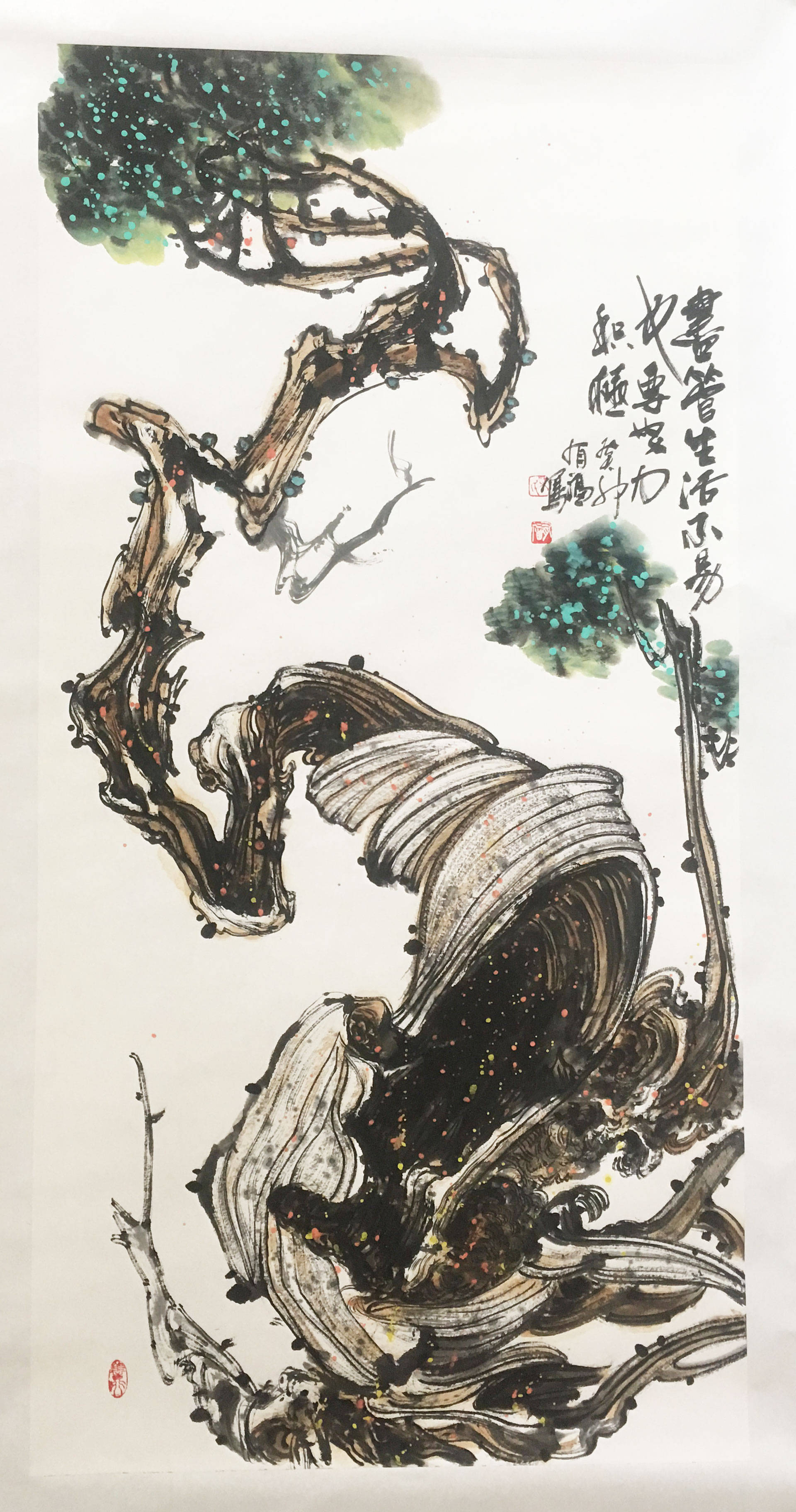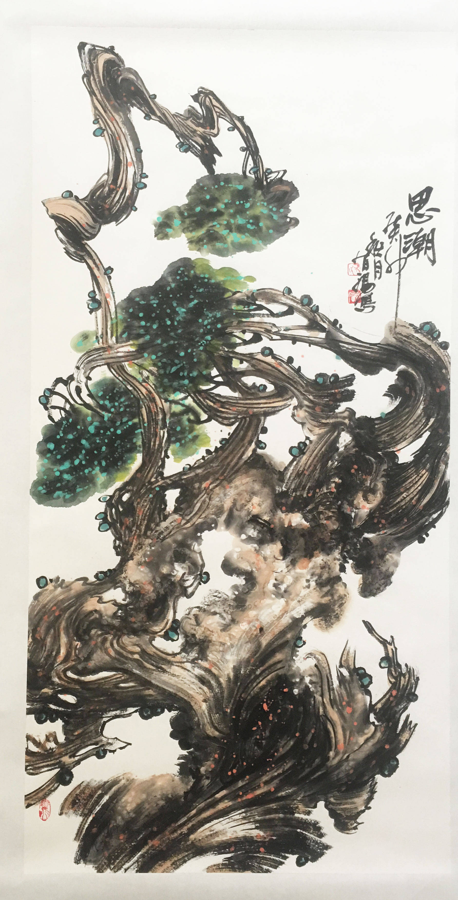 在题材选择上,梁建甫往往聚焦于崖柏在极端环境中的生长姿态,暗喻人与自然的关系,传递出对生态环境的深刻思考。其作品《共生》更是将崖柏根系与山石融为一体,加入金箔点缀,象征自然万物的互联,技法上可见日本琳派的影响。