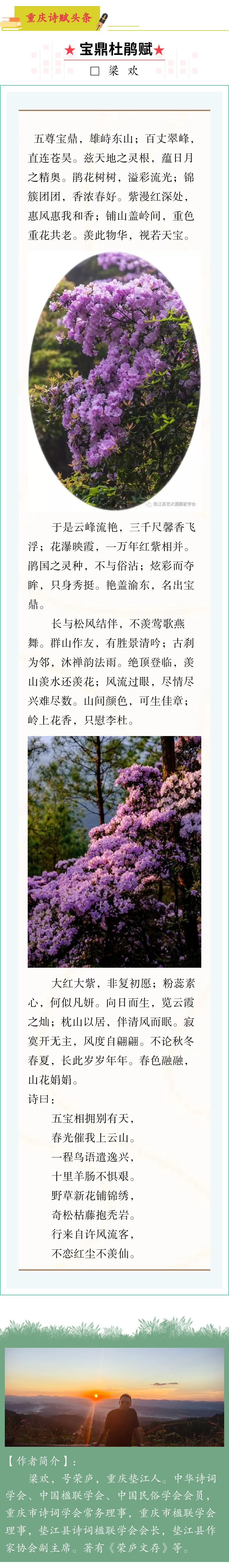 梁欢的《宝鼎杜鹃赋》,宛如一幅绚丽多彩且韵味悠长的画卷,在文字的经纬间勾勒出宝鼎东山那令人心醉神迷的自然盛景与深邃意境,令读者仿若身临其境,感受着自然与人文交织出的璀璨华章。