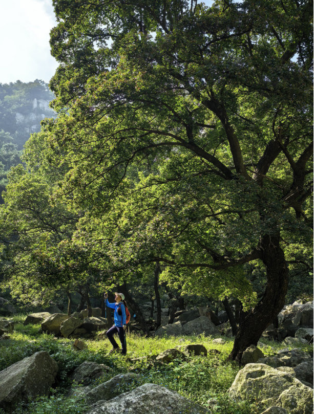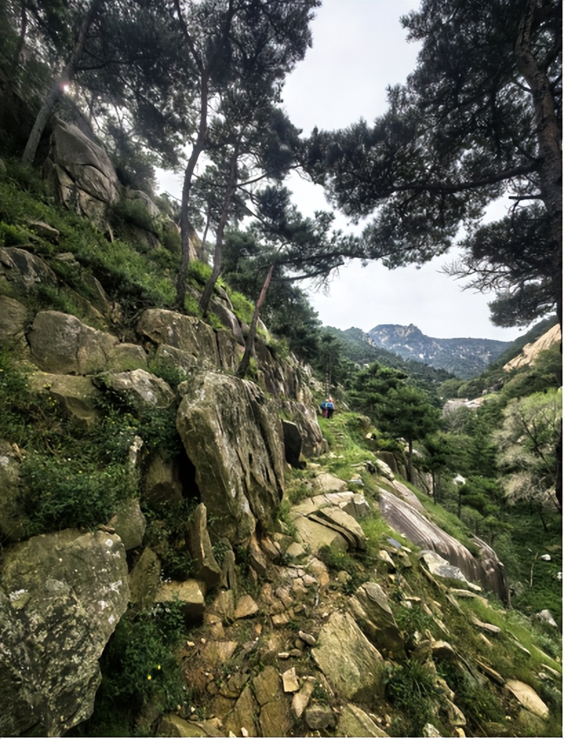 感慨一番继续前行,不知不觉来到了三沟交叉的路口。峰回路转,景色愈加迷人,松林中宽不及尺、蜿蜒上升的小路,静谧悠长,诗意梦幻,走着走着,那“千岩万转路不定,迷花倚石忽已暝”的词句,就浮出了脑海;红褐色的崖壁前,一棵高大的松树下,眼前竟幻化出了“松下问童子,言师采药去”的画面。