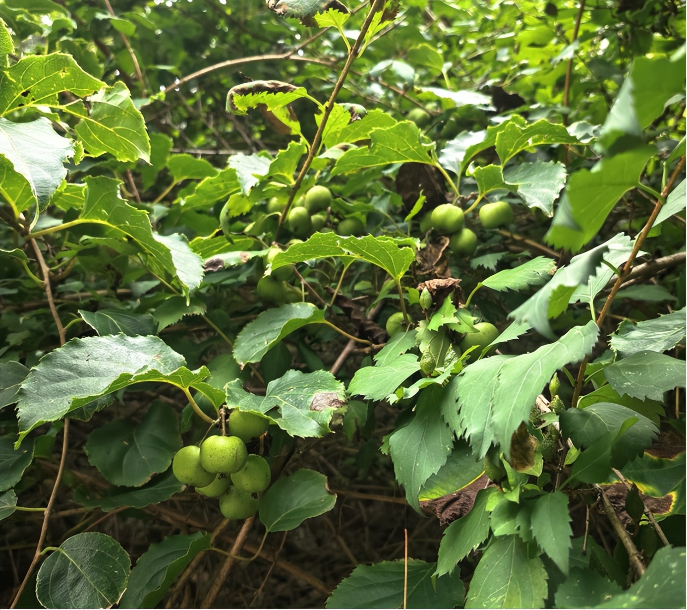 前行乱石嶙峋,灌木丛生,坡度极大,每一步都要付出很大的气力,既要小心藤条的羁绊、乱石的湿滑,还要时时防着蛛网的纠缠、树枝的抽打。经过半个小时的奋力攀登,上到海拔950米左右的时候,终于看见了那山崖上一棵连着一棵的软枣猕猴桃。