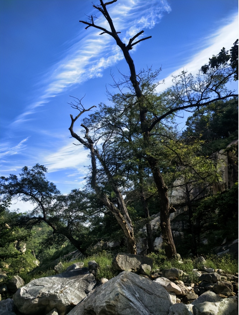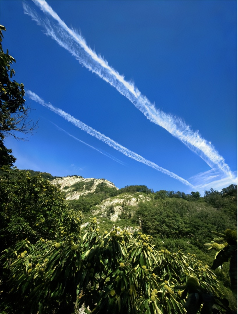 穿过这片茂密的栗树林,上到一处崖壁,眼前豁然开朗。抬头回望,只见孤顶山方向,湛蓝的天空中,似有一把银梭,正在空中编织着一匹匹的银练,煞是惊艳。静静伫立,看云卷云舒,聚聚散散,禁不住心潮起伏,感慨万千。