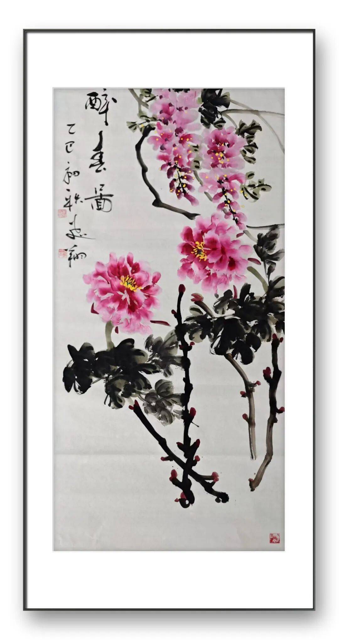 色彩的运用同样是易飞翔老师牡丹画的一大亮点。他笔下的牡丹,色彩艳丽却不媚俗,热烈却又不失雅致。那一朵朵盛放的牡丹,或绯红如霞,或粉润似玉,色彩的晕染自然而流畅,从花瓣的边缘到花心,过渡得细腻而和谐。这种色彩的处理,既承袭了中国传统工笔牡丹设色的精妙,又融入了写意画的洒脱,使得牡丹的娇美与华贵被展现得淋漓尽致。同时,他还善于运用对比色来增强画面的视觉冲击力,比如以墨色的浓黑来衬托牡丹花色的艳丽,让花朵在画面中更加突出,仿佛呼之欲出,瞬间抓住观者的眼球。