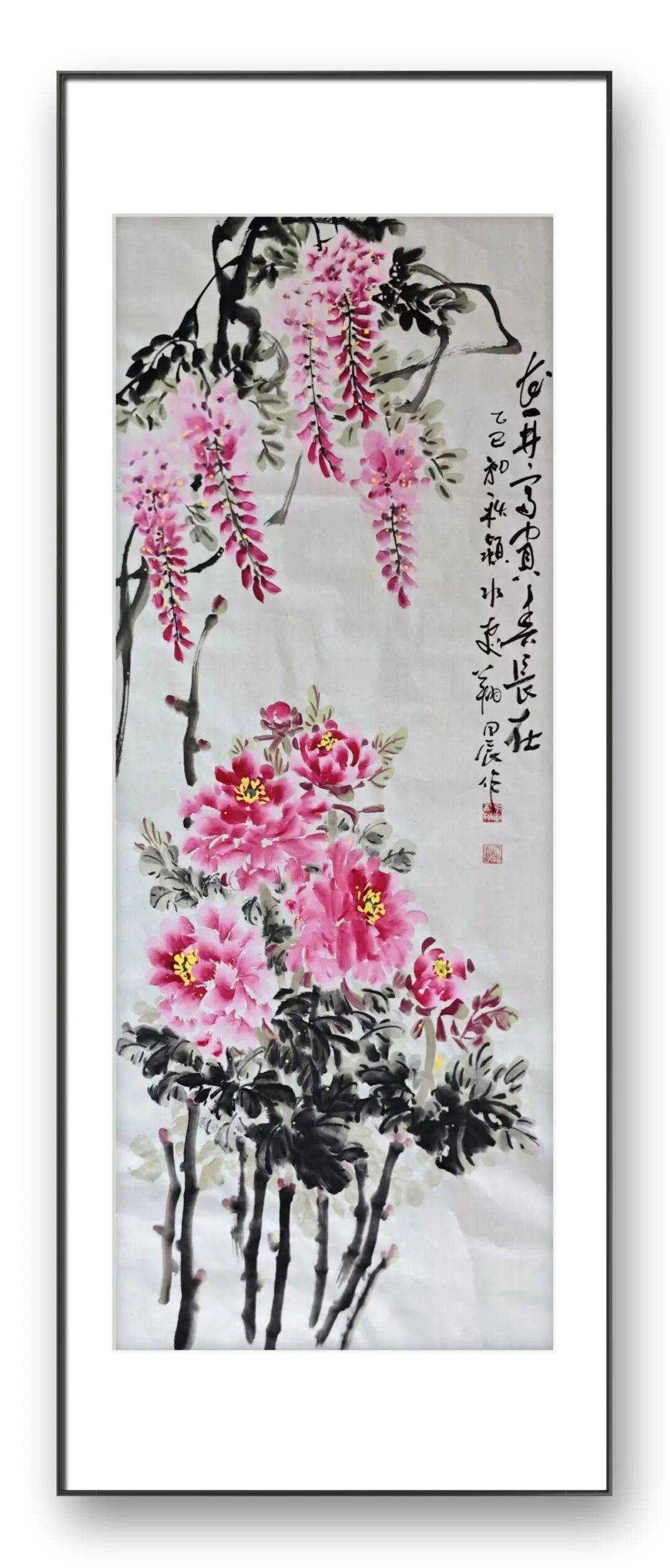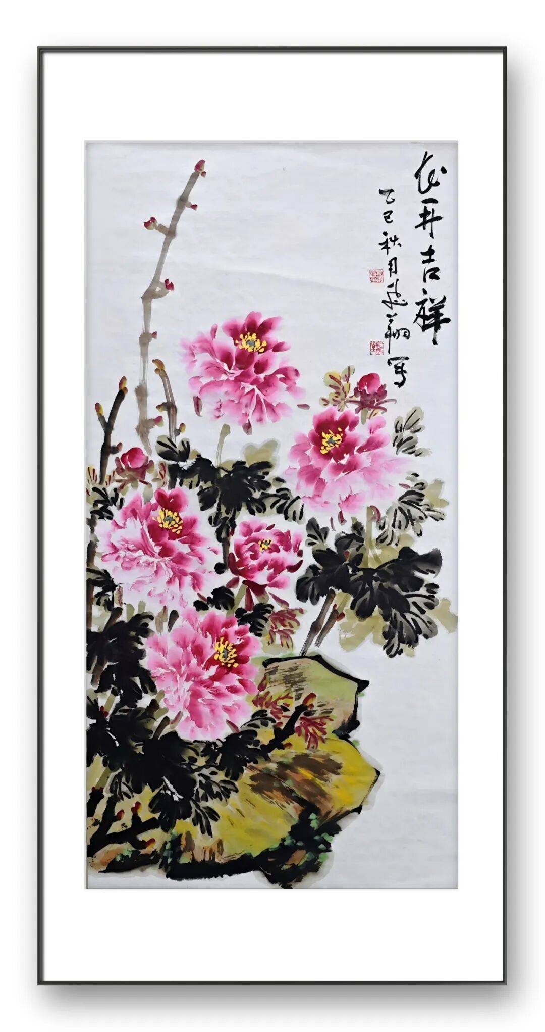 更为难得的是,易飞翔老师的牡丹画并非仅仅是对牡丹外在形态的描摹,更蕴含着他对牡丹精神内质的深刻体悟与表达。牡丹,向以“国色天香”闻名,象征着繁荣昌盛、高贵典雅。在他的画中,牡丹不再是单纯的自然花卉,而是成为了一种精神符号。那花朵的雍容华贵,是对盛世气象的艺术化诠释;那枝干的挺拔坚韧,又暗含着一种不屈与向上的力量。画家通过笔墨与色彩,将自己对生活的热爱、对美好事物的向往,以及对传统文化精神的尊崇,都融入到了牡丹的形象之中,使得每一幅牡丹画都具有了超越物象本身的精神价值,成为了观者与画家进行精神交流的载体。
