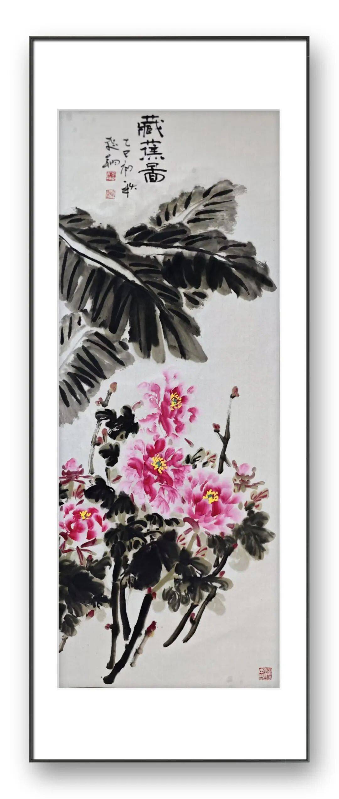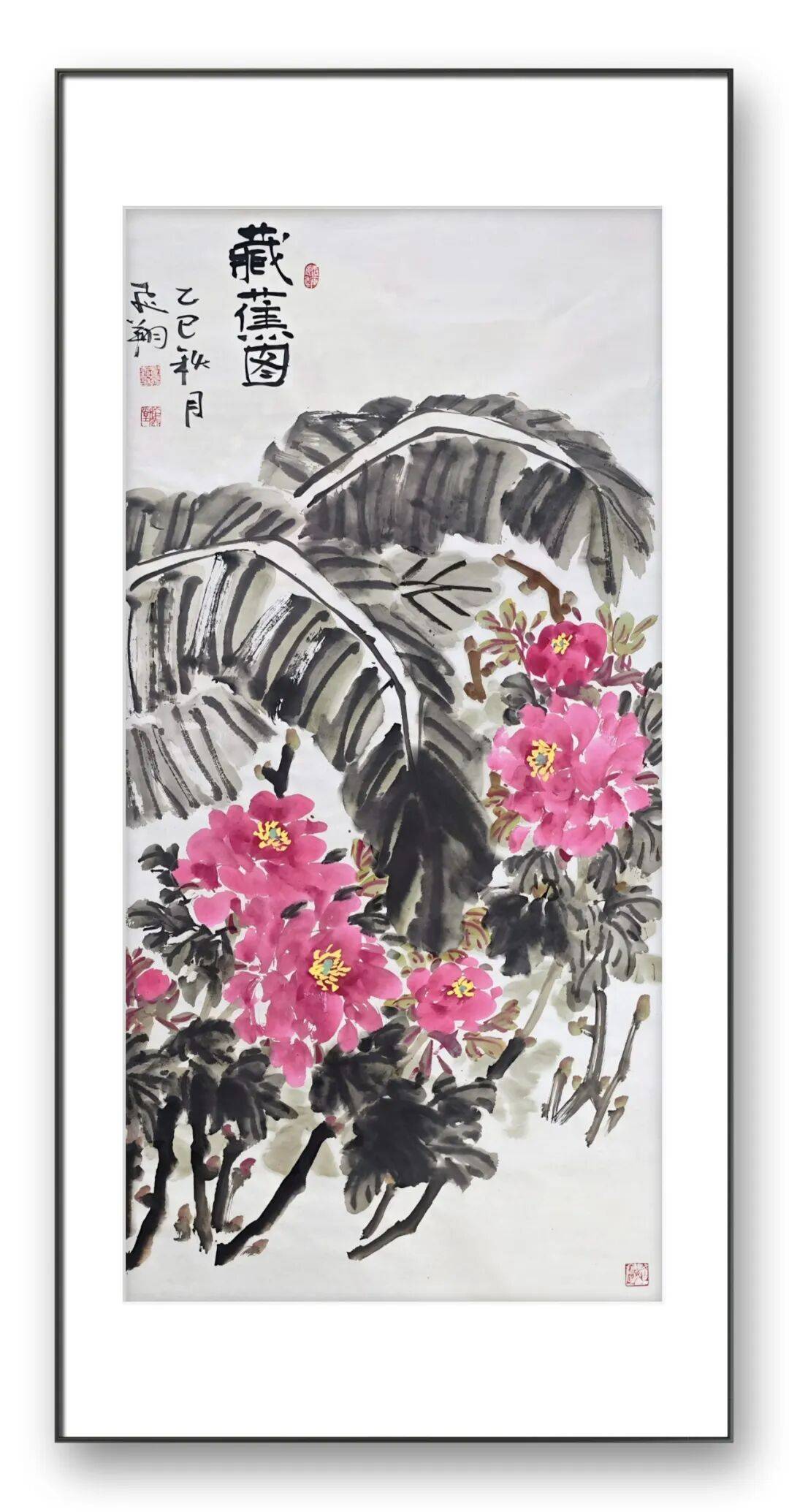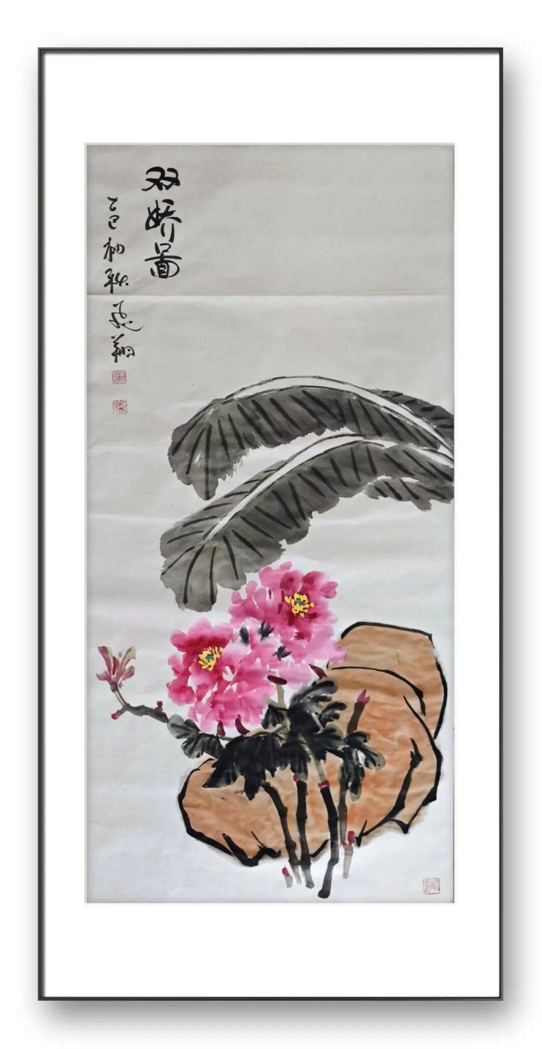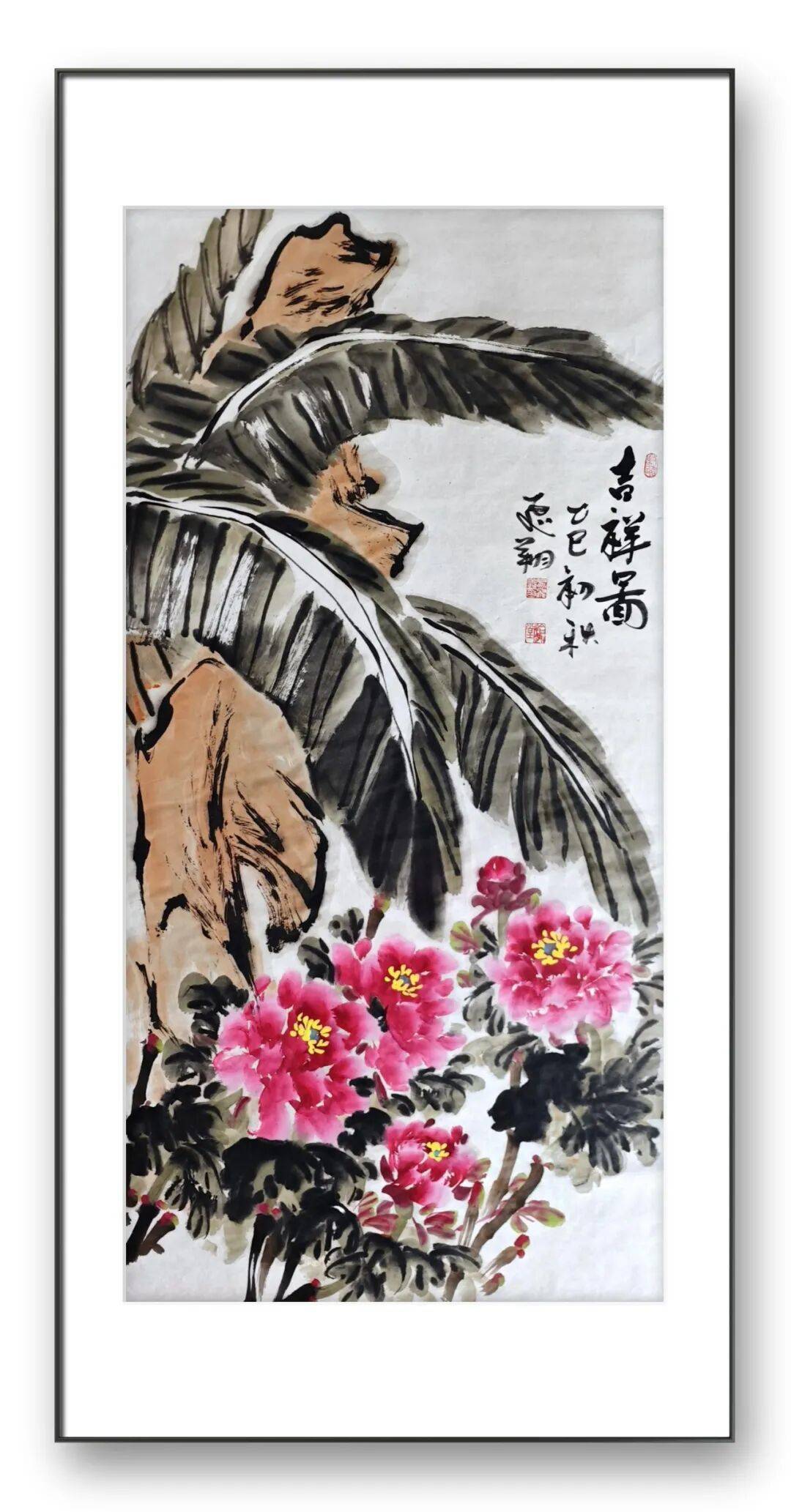 从构图上看,易飞翔老师的牡丹画也颇具巧思。他突破了传统牡丹画中对称、均衡的固有模式,大胆采用留白、虚实相生等手法。有的画面中,牡丹花枝斜出,花朵集中于一侧,而另一侧则以大片的空白营造出空灵的意境,给人以想象的空间,仿佛那空白之处是悠悠的天际,或是弥漫的花香;有的则将牡丹与芭蕉、岩石等元素相结合,通过不同物象的形态对比与空间布局,构建出富有节奏感与韵律感的画面,使整幅作品既有牡丹的娇艳,又有其他物象带来的古朴与苍劲,丰富了画面的层次与内涵。