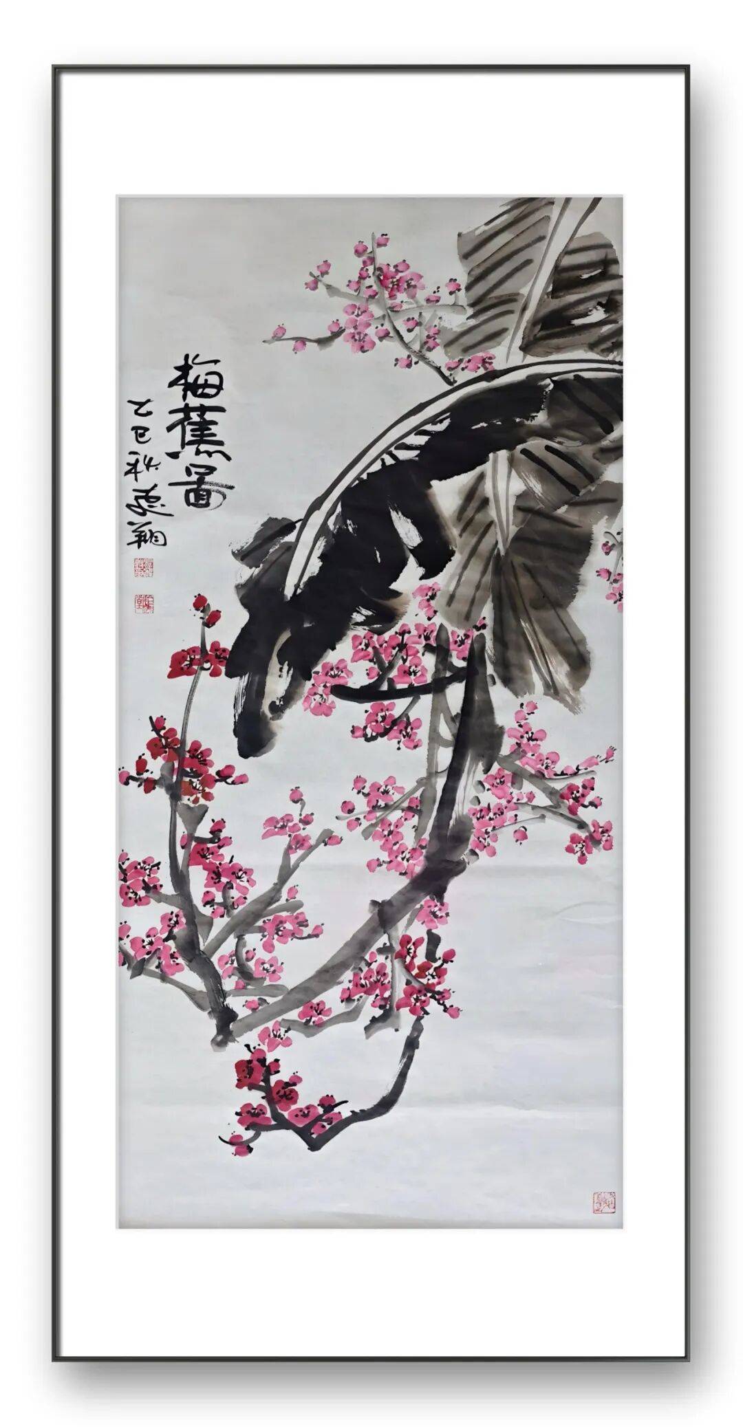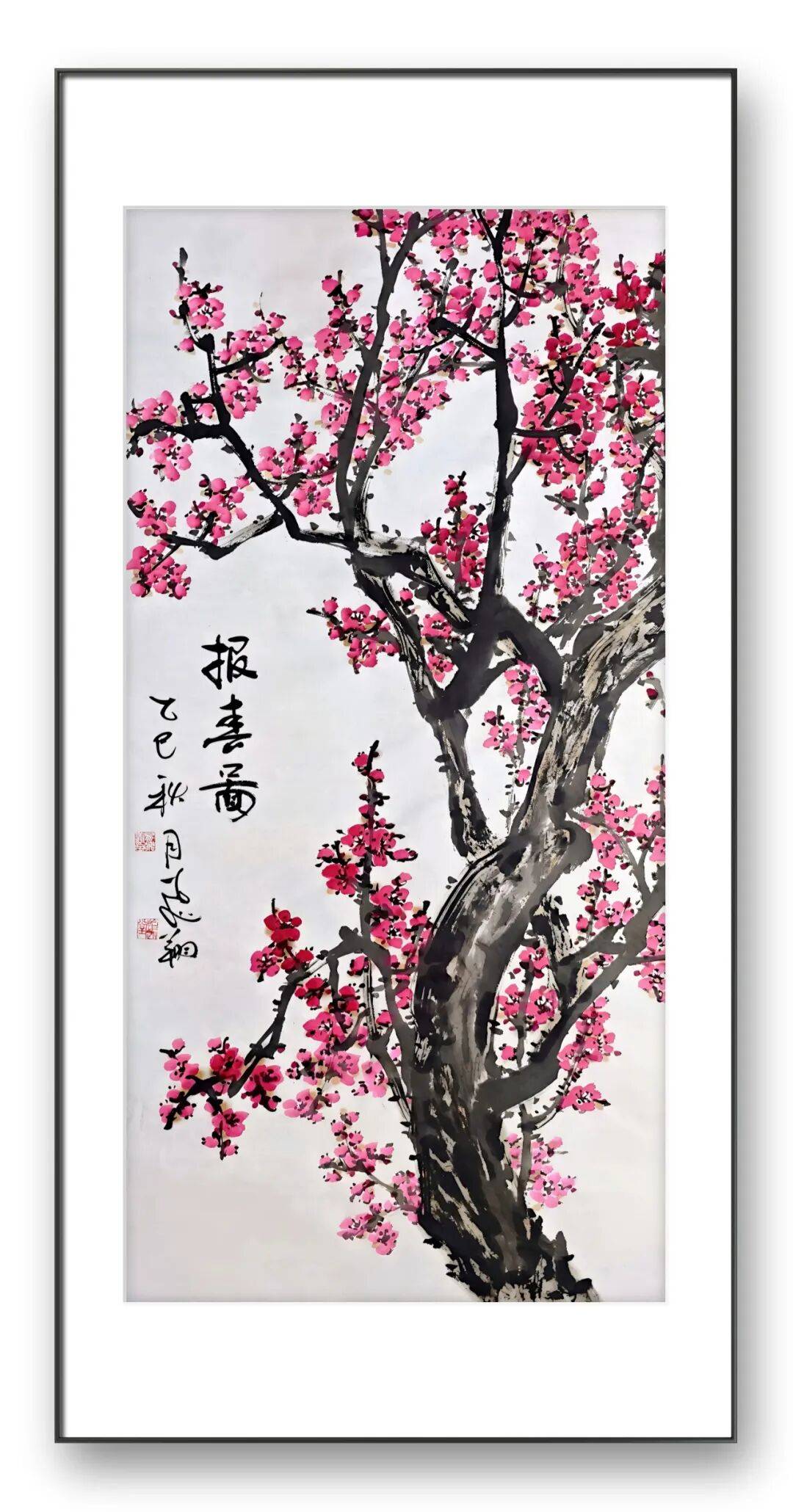 易飞翔老师作品中梅花枝干苍劲有力,以浓墨精心勾勒,线条粗细变化自然,将梅枝的坚韧与遒劲展现得淋漓尽致,仿佛能让人触摸到那历经岁月沧桑的质感。朵朵梅花绽放枝头,粉色的花瓣晕染得层次分明,有的含苞待放,似羞涩的少女;有的完全盛开,如热情的舞者,在枝头奏响报春的乐章。笔墨间,既有着工笔的细腻,又不失写意的洒脱,把梅花 “俏也不争春,只把春来报” 的精神内涵巧妙传递,让观者感受到春天即将来临的蓬勃生机与希望。