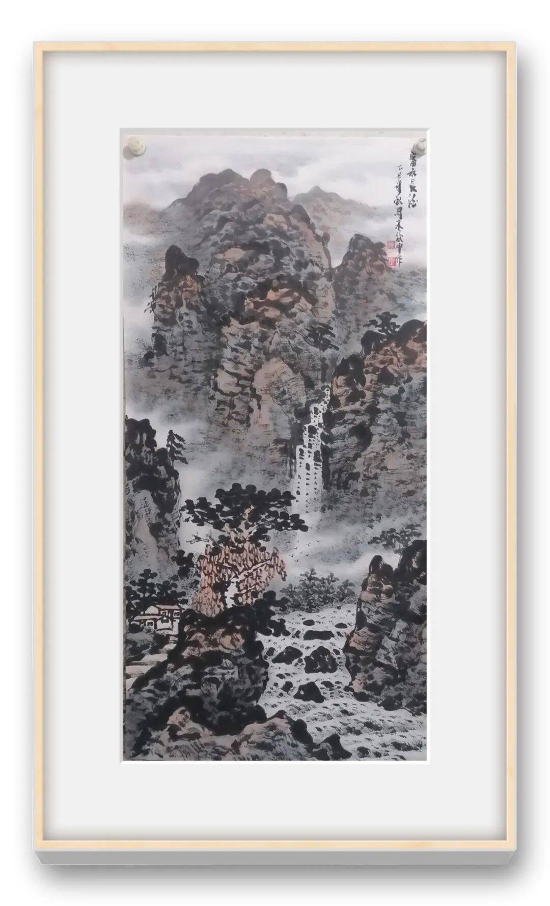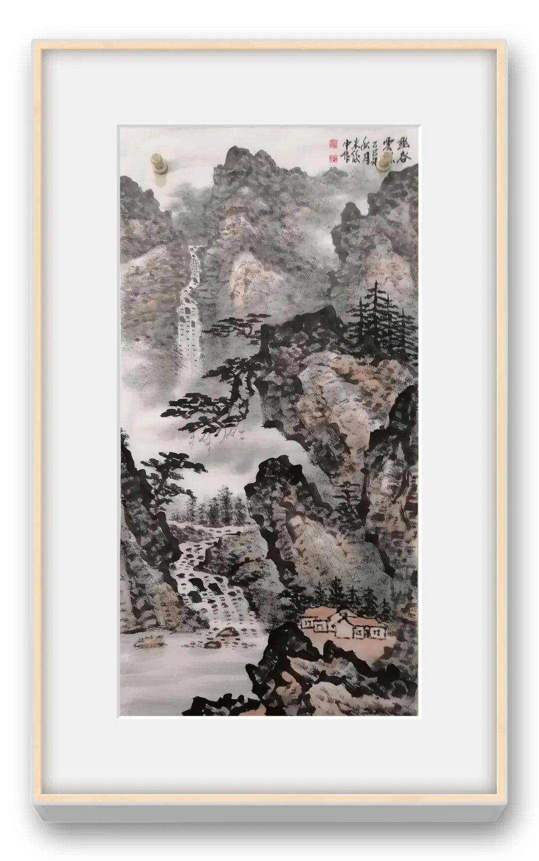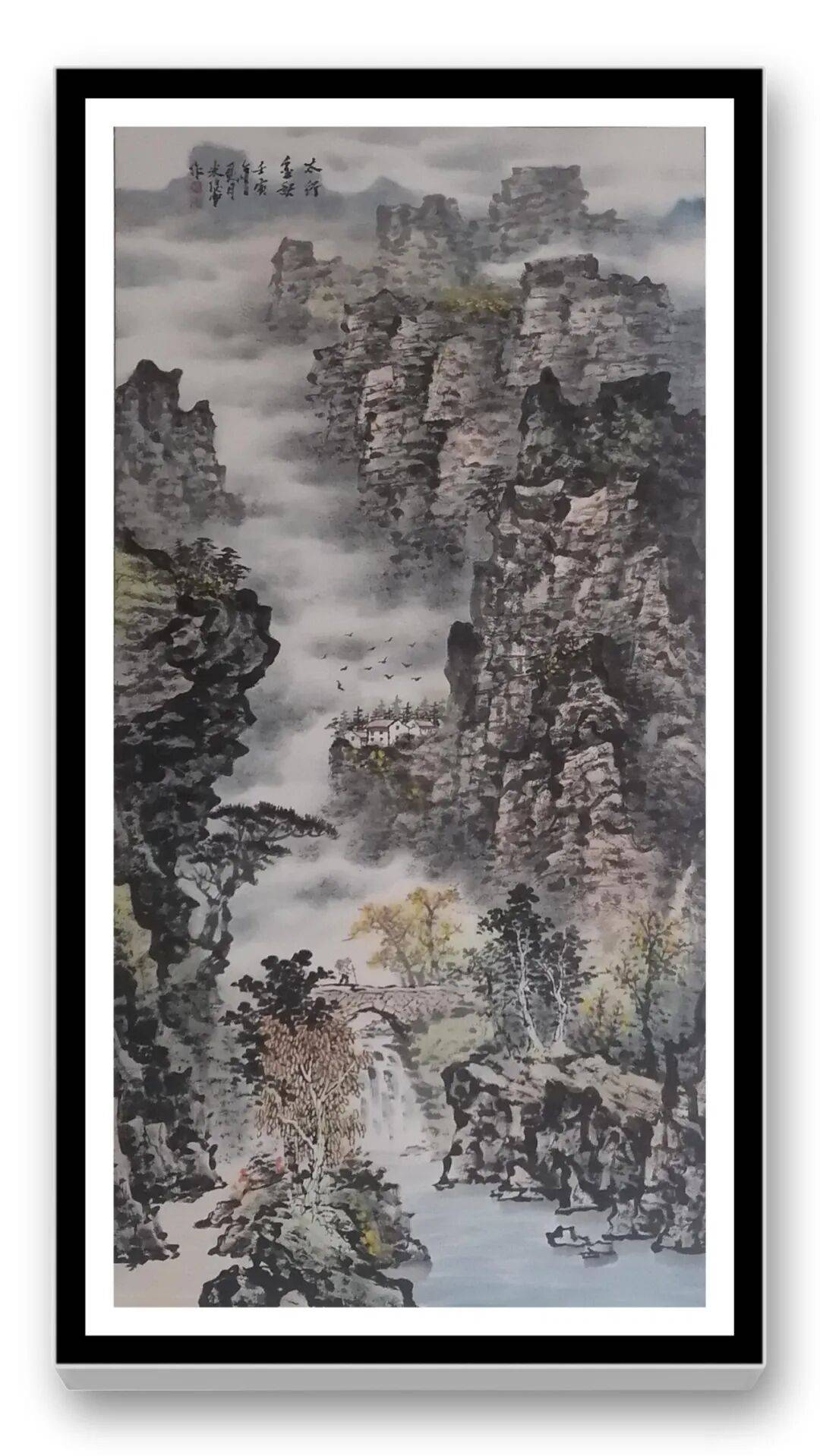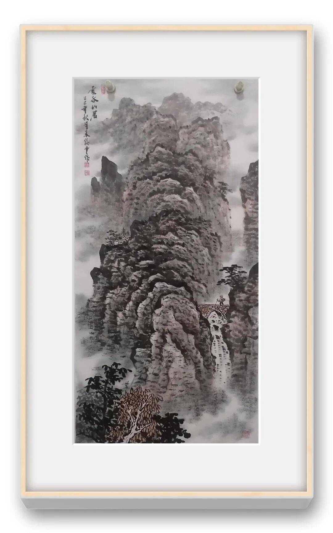 而在墨法的运用上,米俊中先生更是匠心独运。他熟练掌握了泼墨、积墨、破墨等多种墨法技巧,让墨色在宣纸上呈现出丰富的层次与变化。书画里,云雾缭绕的山峦,通过淡墨的层层渲染与积叠,营造出一种朦胧缥缈、若隐若现的意境,将云岭的幽深与神秘展现得淋漓尽致。那浓淡相宜的墨色,如同一首优美的乐曲,有着轻重缓急的节奏变化,使画面充满了节奏感与韵律美。这种对传统笔墨的精准把握与娴熟运用,不仅是对前人艺术成就的致敬,更是为其山水画创作筑牢了根基,让作品具备了深厚的文化底蕴与艺术感染力。