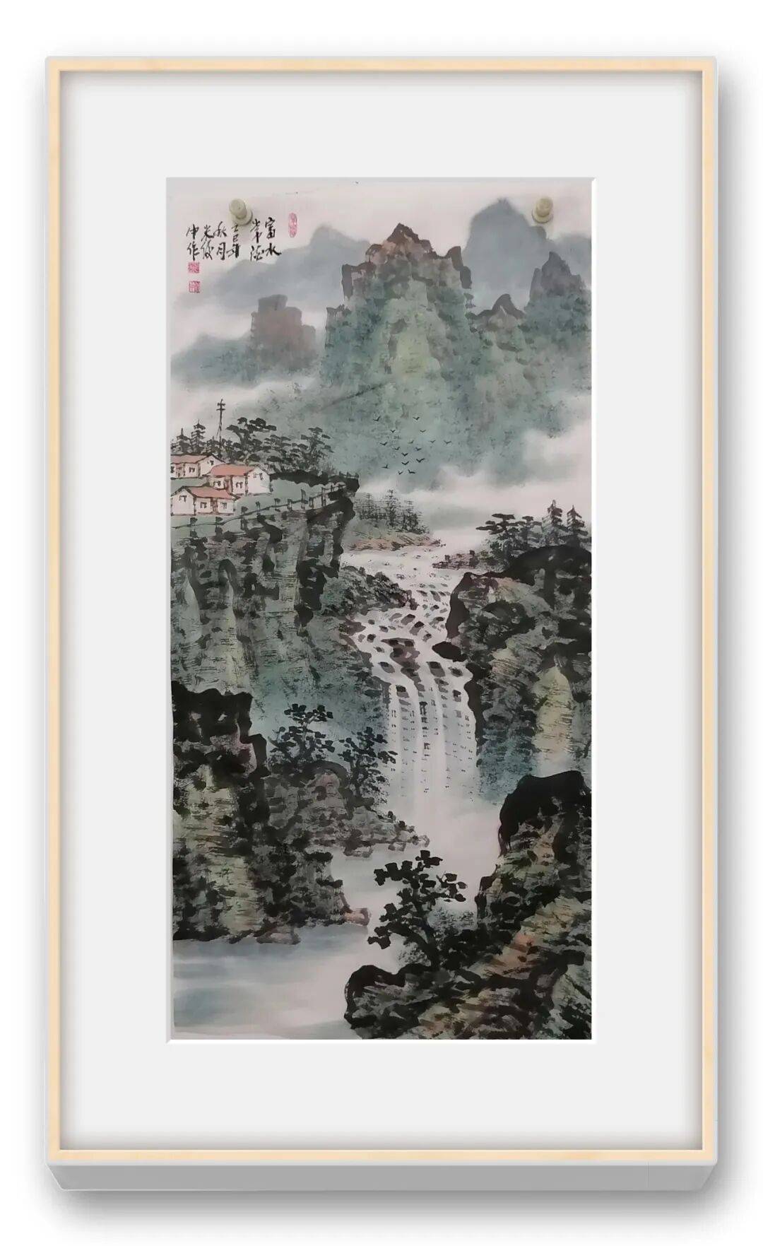 米俊中先生的山水画,虽深植传统,却并非一味复古,而是积极融入时代精神,反映时代风貌。在当代社会,人们对自然的向往、对和谐生活的追求,以及对生态环境保护的重视,都在他的作品中有所体现。他的画作中,常常会描绘一些人与自然和谐共处的场景。山间的村落,或隐于林木之中,或傍于溪流之畔,屋舍俨然,鸡犬相闻,呈现出一种宁静祥和的生活氛围。这既是对传统田园牧歌式生活的向往与追慕,也是对当代人渴望远离城市喧嚣、回归自然本心的精神诉求的回应。在快节奏的现代生活中,这样的画面能让观者的心灵得到片刻的宁静与慰藉,唤起人们对美好生活的憧憬。