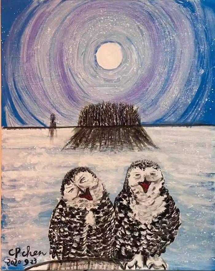 在那幅雪夜猫头鹰图中,澄澈的月光如银纱洒落,雪地泛着静谧的光,两只猫头鹰神态亲昵、似在欢歌。雪夜本易给人清冷之感,可它们的存在,让画面满是温暖生机。就像袁了凡所说 “从前种种,譬如昨日死;从后种种,譬如今日生”,过往的沉寂都成了昨日云烟,当下这雪夜里的相伴与欢愉,是全新的开始,是生命在每一个 “今日” 的鲜活绽放,也让我们看到,美好世界藏在每一个被爱与温暖包裹的瞬间。
