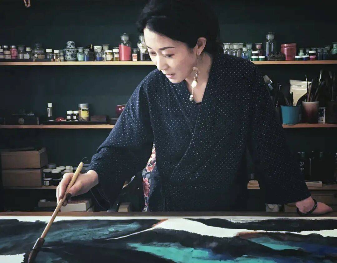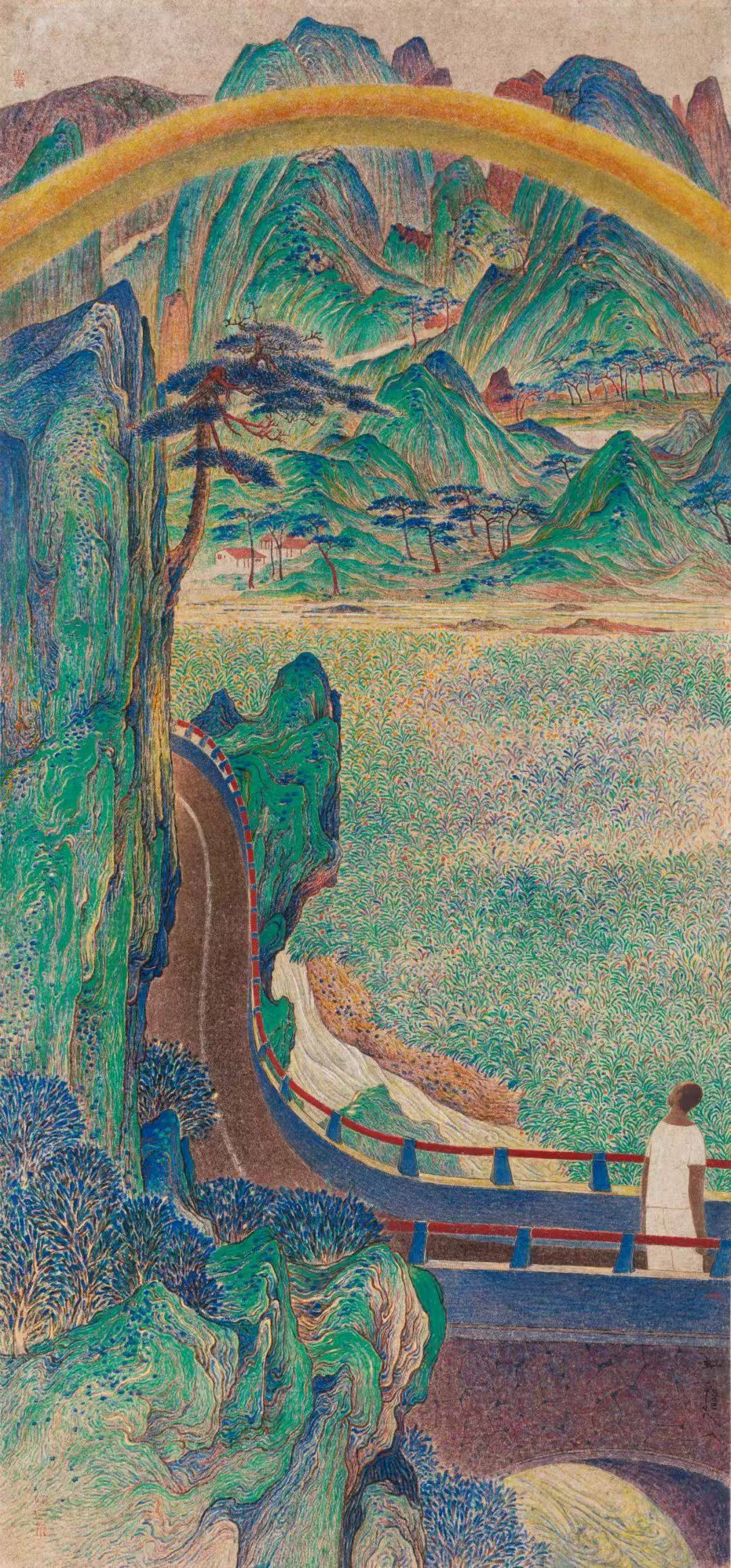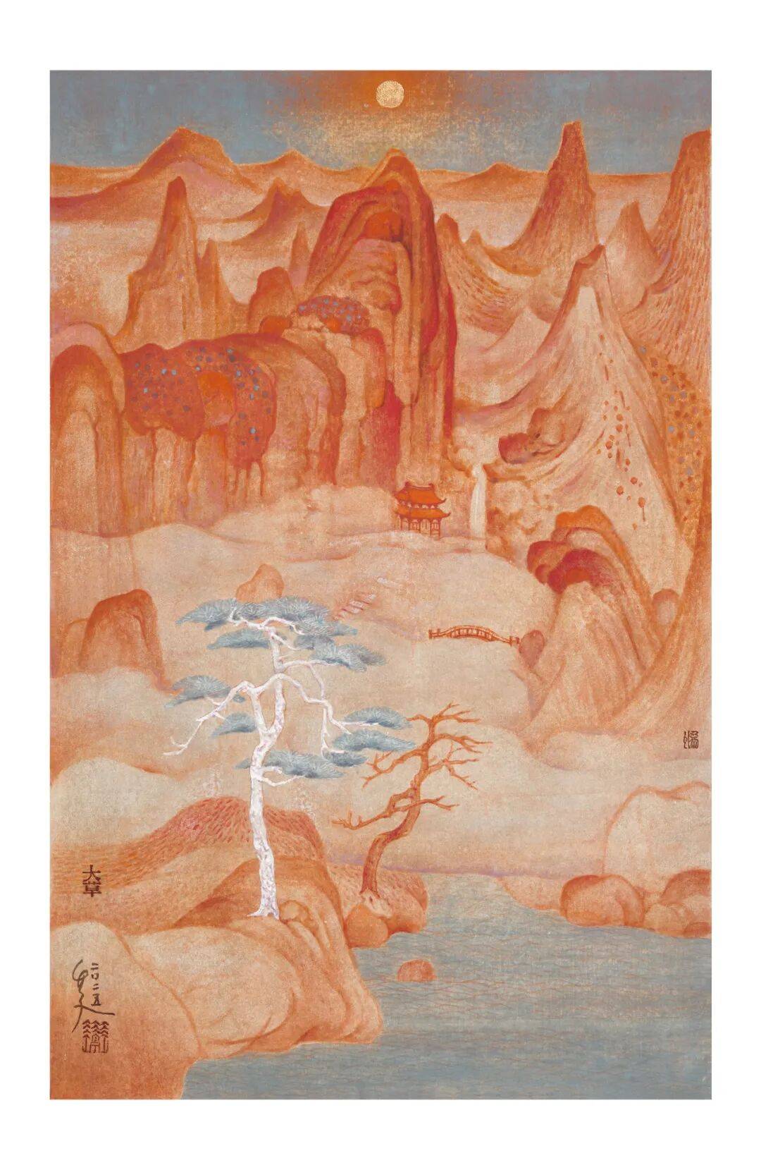 而在“创新”维度,她的探索同样耀眼。2014年获“中国美术总评榜中国画十大年度艺术家特别贡献奖”,2016年获评《现代青年》最佳国画艺术家,这些荣誉背后,是她对工笔重彩语言的当代转译。她打破传统工笔重彩题材的边界,将山水、人文、哲思熔于一炉;在色彩运用上,既保留矿物质颜料的厚重质感,又大胆尝试色调的主观调配,如这幅参展作品中,以大面积朱砂红营造出的山水意境,既不是对自然山水的写实摹写,也不是传统水墨的“烟云供养”,而是以色彩的情绪张力构建出的精神山水。