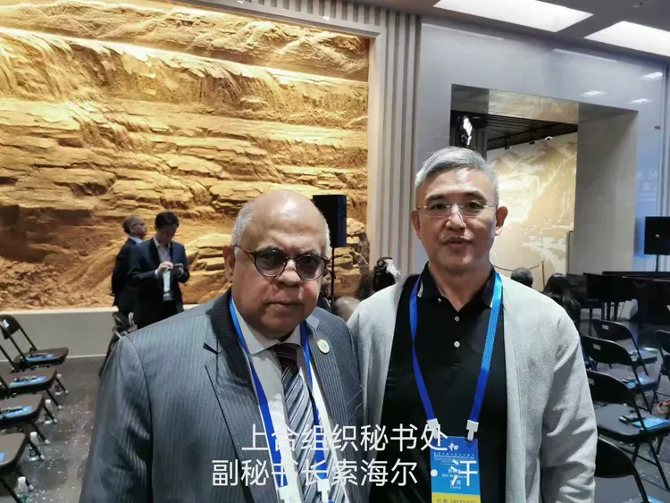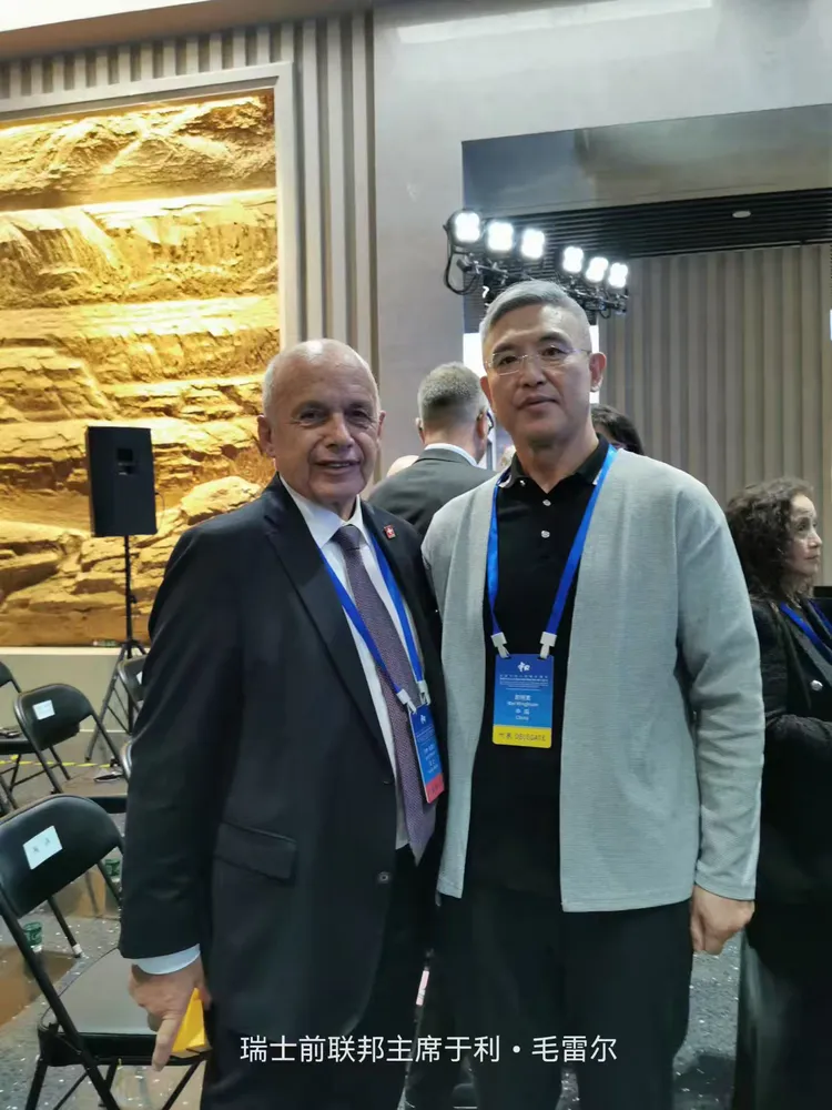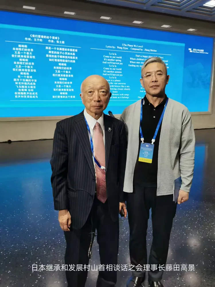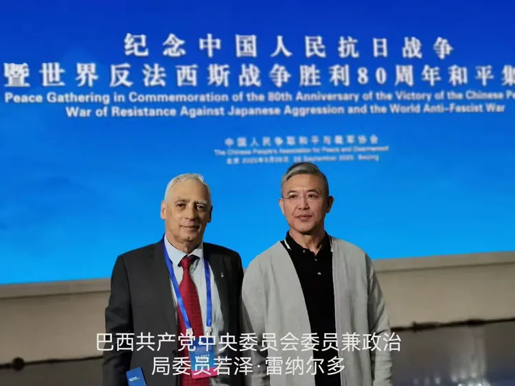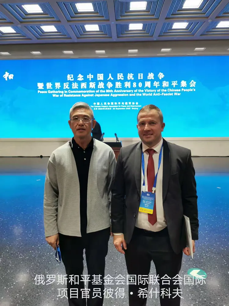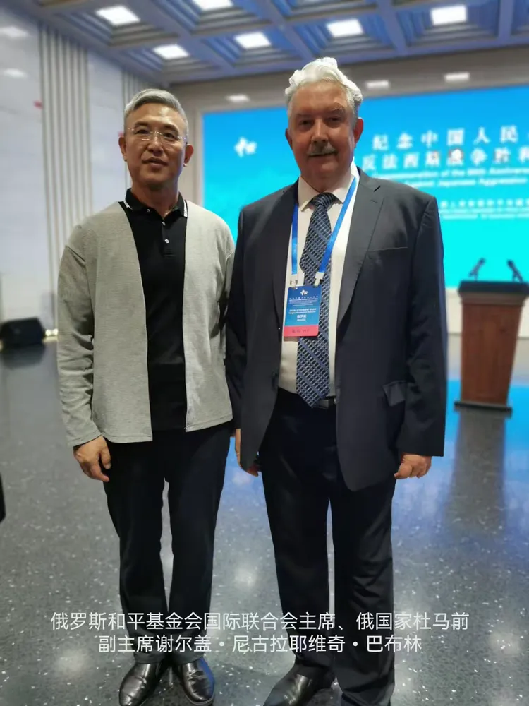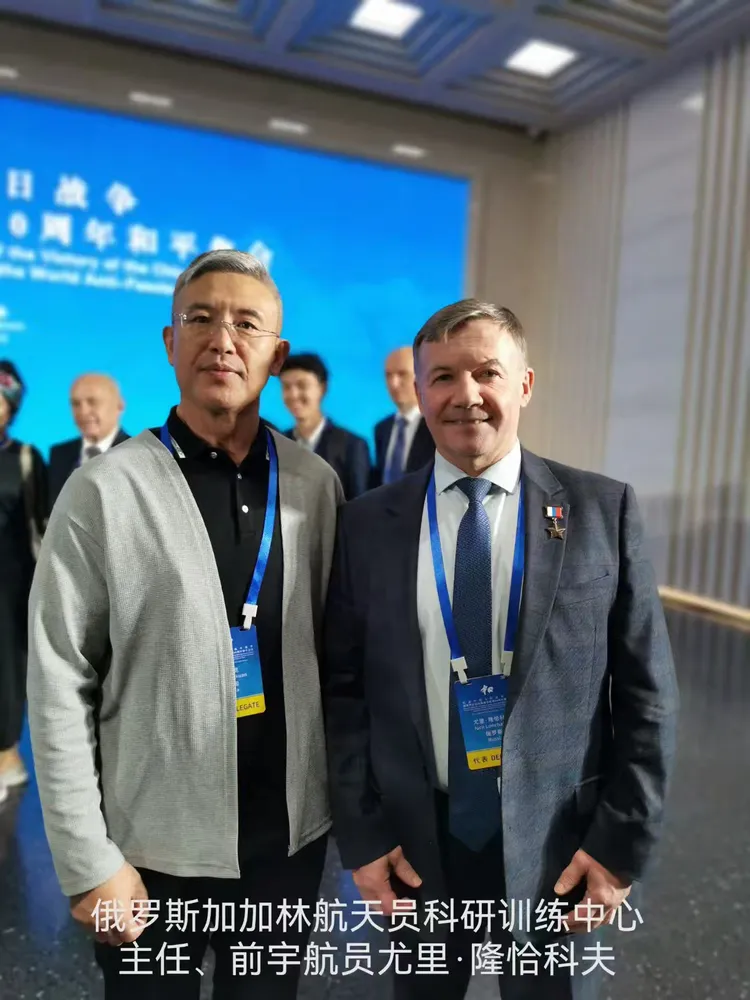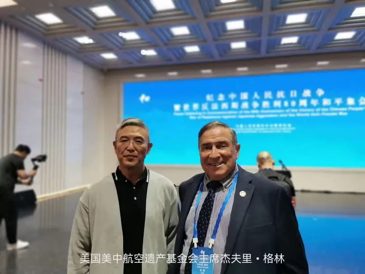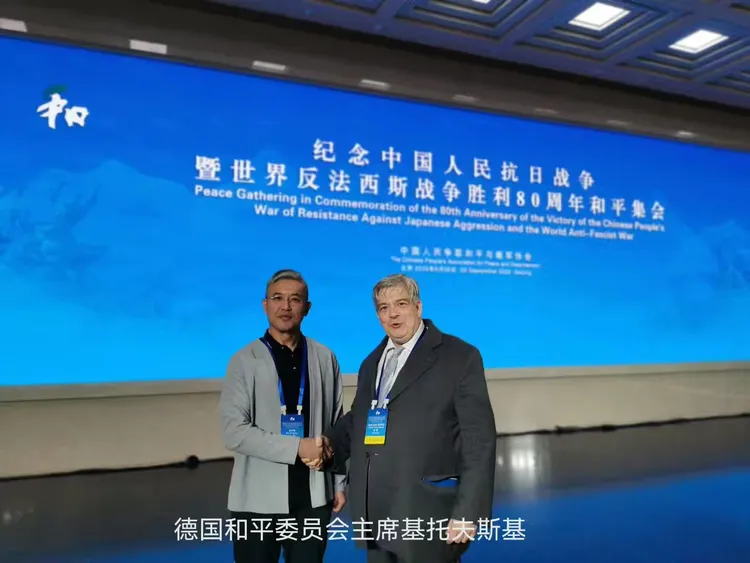 尉明宽与参加中国人民抗日战争暨世界反法西斯战争胜利80周年和平集会的国际人士留影