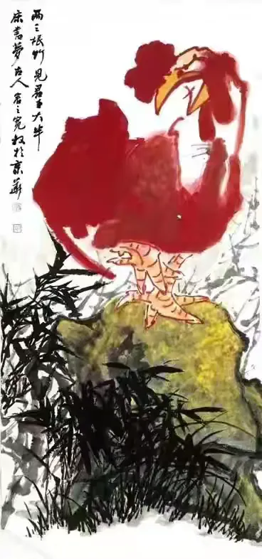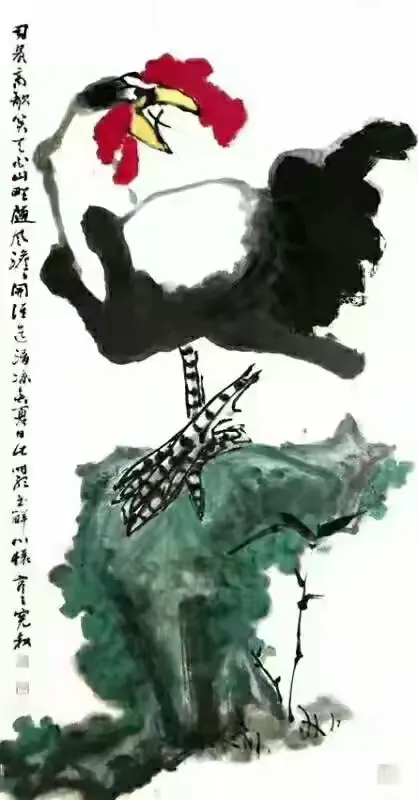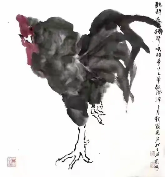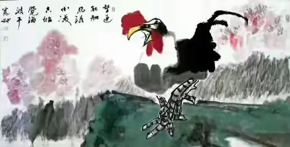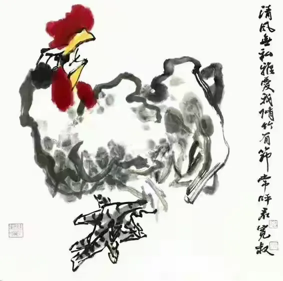 细读其诗,可见诗人对生命尊严的礼赞、对时间秩序的敬畏(“此生只爱司晨唱”)、对信念情操的执着(“唯有东风歌悦耳”),更有对民族气节的隐喻与呼唤(“不惧风云雷雨变”)。那面东而立、昂首长鸣之雄鸡,岂止是农家司晨之畜?实乃东方醒狮之象征,是民族精神不屈的图腾(“一声能教天下白”)。在此意义上,尉明宽之鸡,已超越个体艺术创作,成为一种文化符号,承载着传统美德与现代人格的理想融合。