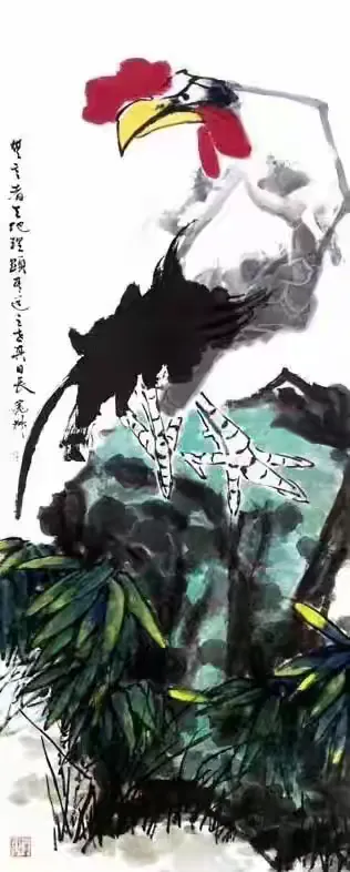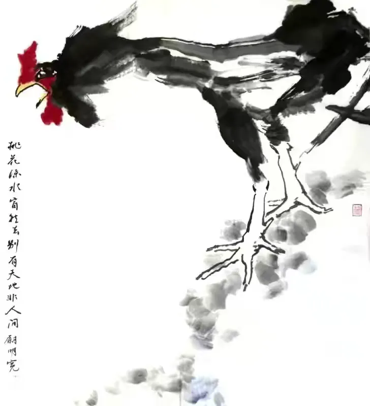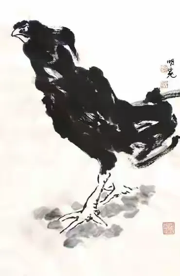 《韩诗外传》有言:“鸡有五德:首戴冠者,文也;足搏距者,武也;敌在前敢斗者,勇也;见食相呼者,仁也;守夜不失时者,信也。”尉明宽深契此理,遂将此伦理内化于笔墨之间。其所作百鸡千姿,或引颈长鸣以报晓,或护雏温饱以尽慈,或怒目待敌以显威,或群聚相呼以彰义。每一幅皆非简单摹形,而是借鸡喻人,托物言志,使观者在雄强笔力中感受正气,在泼墨重彩里体味深情。