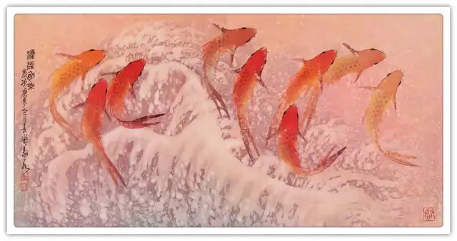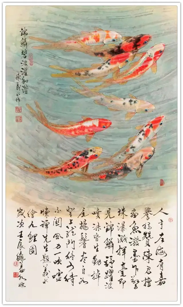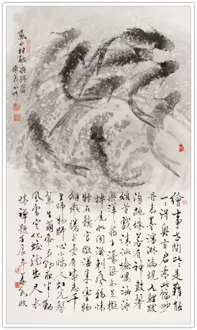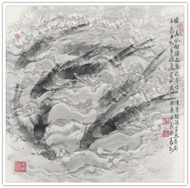 近年来,我创作的《春江水暖》、《鱼跃龙门》等系列作品,不仅追求艺术上的突破,更着力展现新时代的精神气象。那灵动自如的游鳞,仿佛在诉说着改革开放的丰硕成果;那鱼水交融的画面,恰如党群一心、民族团结的生动写照;那欢快畅游的鱼群,正是亿万中国人民在新时代幸福生活的真实缩影。