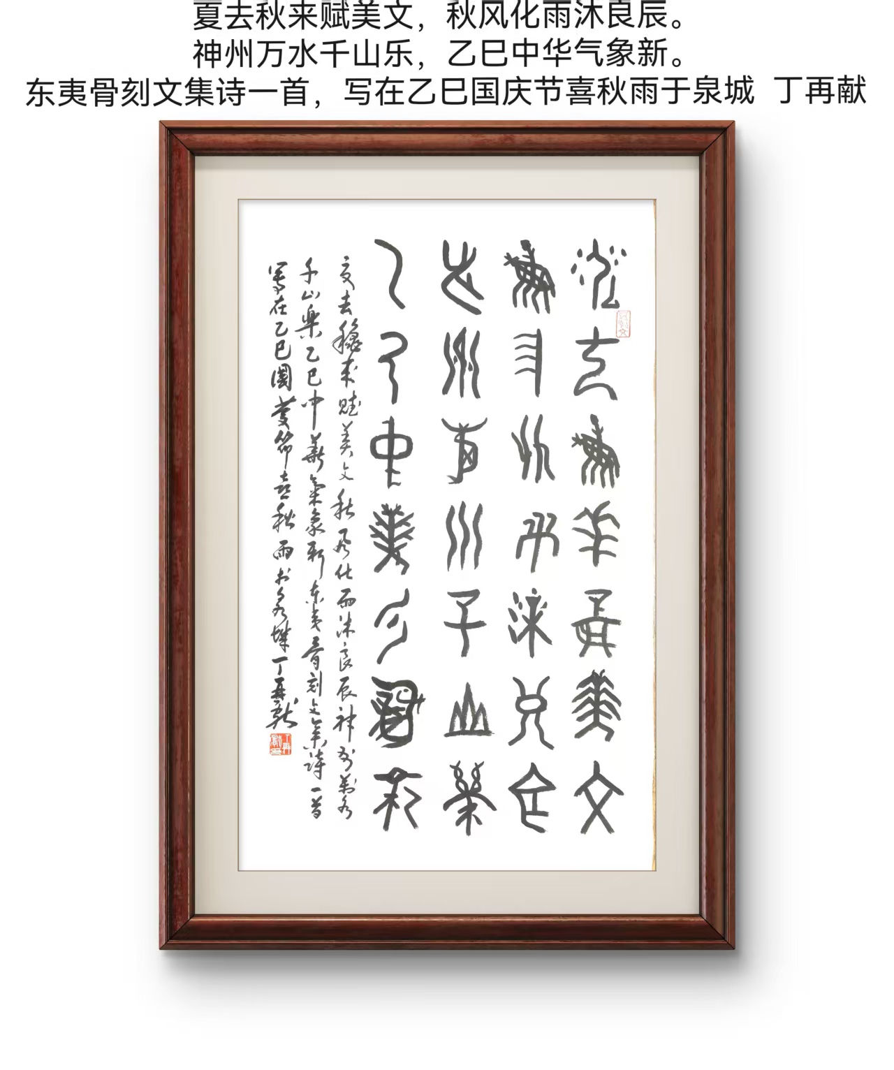 2025年的国庆日,泉城济南笼罩在一场淅淅沥沥的秋雨中。当大多数人沉浸在假日的闲适里,著名文化学者丁再献先生临窗听雨,心中涌起的却是一份跨越五千年的澎湃诗情。他不是在用普通的汉字书写,而是调动着远古的记忆——那些镌刻在兽骨上的“东夷骨刻文”符号,为他笔下的新时代颂歌,注入了最为古老而厚重的底蕴。