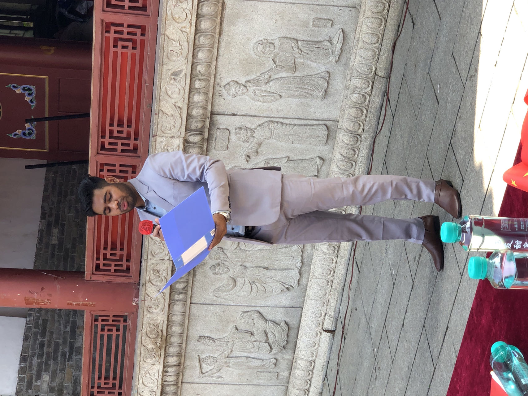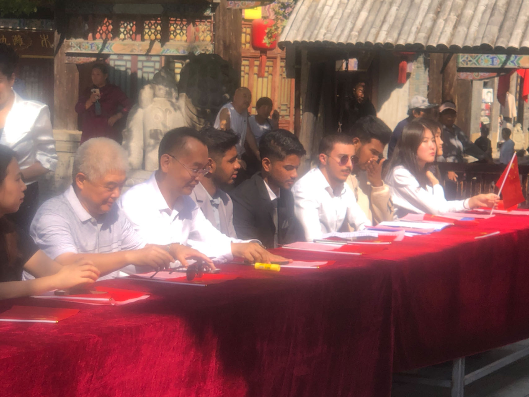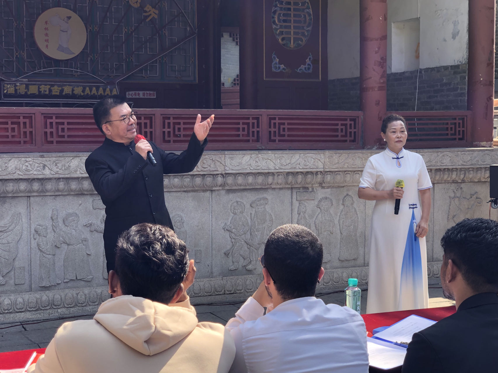 忆昔於陵故地,商埠繁华冠齐鲁;看今朝周村新景,诗潮澎湃动四方。歌手诗豪临胜地,携笔底风雷,绘山河锦绣;西洋学子登雅台,带异域风情,诵华夏诗行。主人胸藏拏云志,皓齿清谈如玉振;宾客心怀向学情,丹唇轻吐韵悠长。彩旗日日迎风舞,今日掌声彻八荒;古调新声相和鸣,中外一家话盛昌。