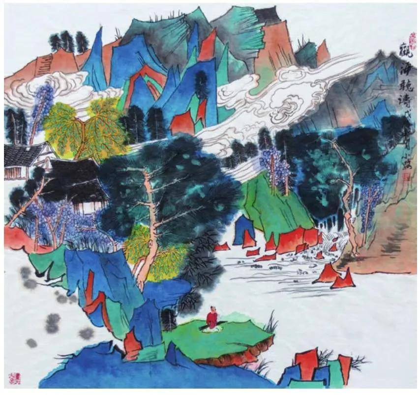 笔墨语言:其笔力遒劲而不失秀润,构图多采用"巨障高壁"式的大气布局(如《青山绿水有人家》),同时以水墨皴擦增强山石的质感,工写结合间兼具磅礴与精微。