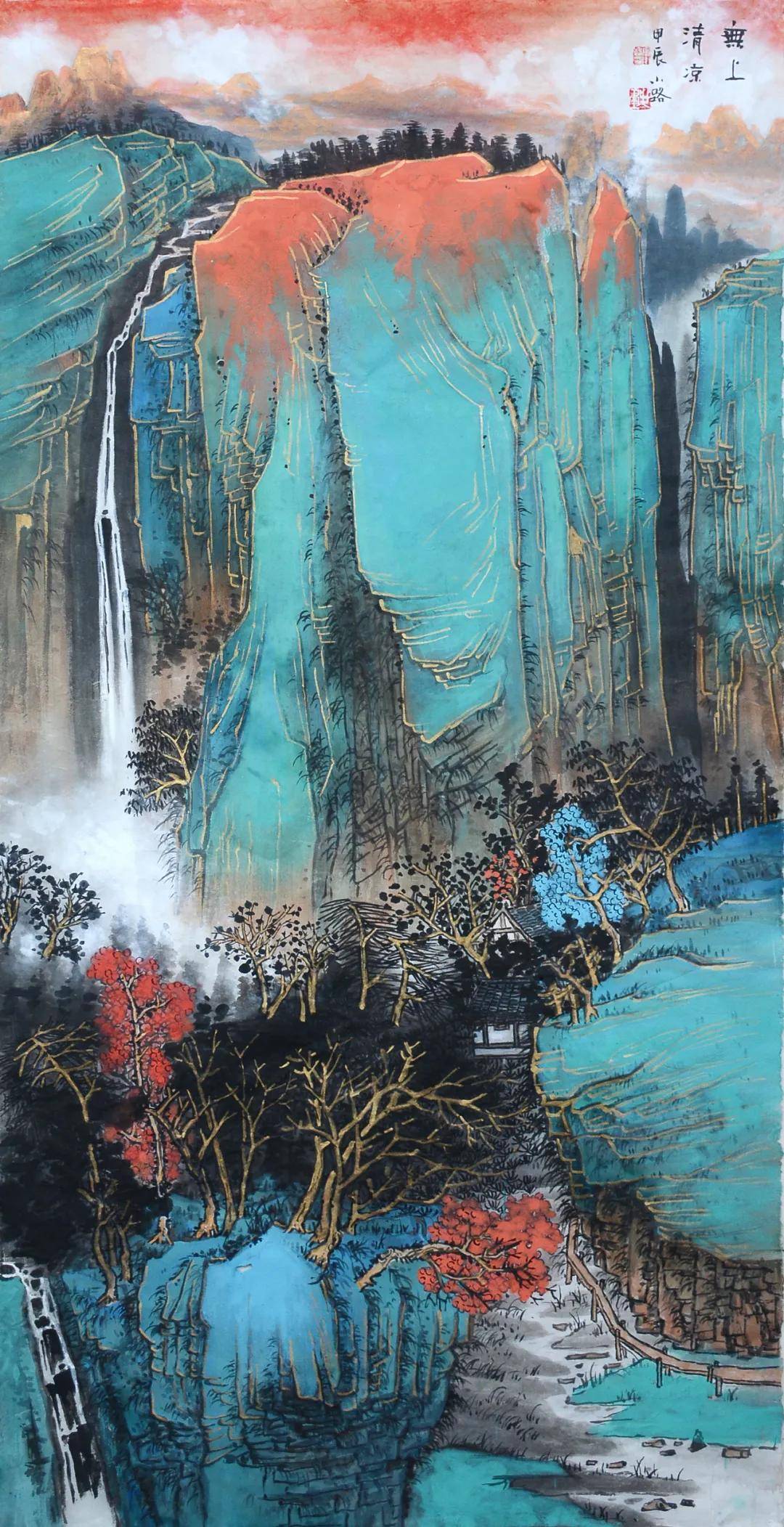 意境营造:她的画面常通过虚实相生、工写结合的手法,营造"可游可居"的意境。例如《清凉世界》中,远山的神秘与近景屋舍的宁静形成对比,传递出超越自然的理想化境界。