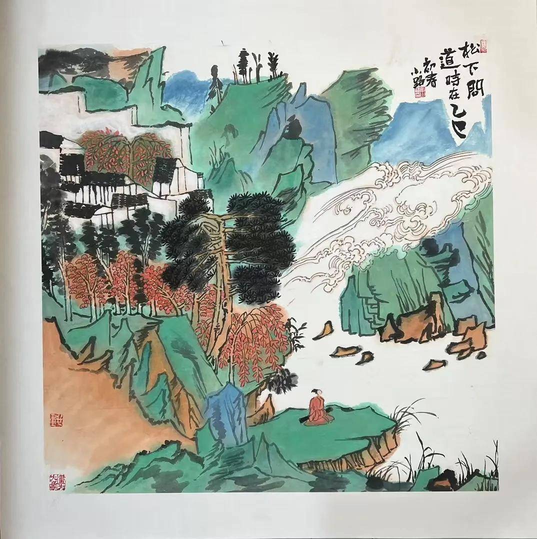 《流水无声》:通过溪桥渔浦的掩映布局,展现"溪水清音"的听觉通感。画面以青绿为基调,融入水墨晕染,形成色墨互衬的韵律感。