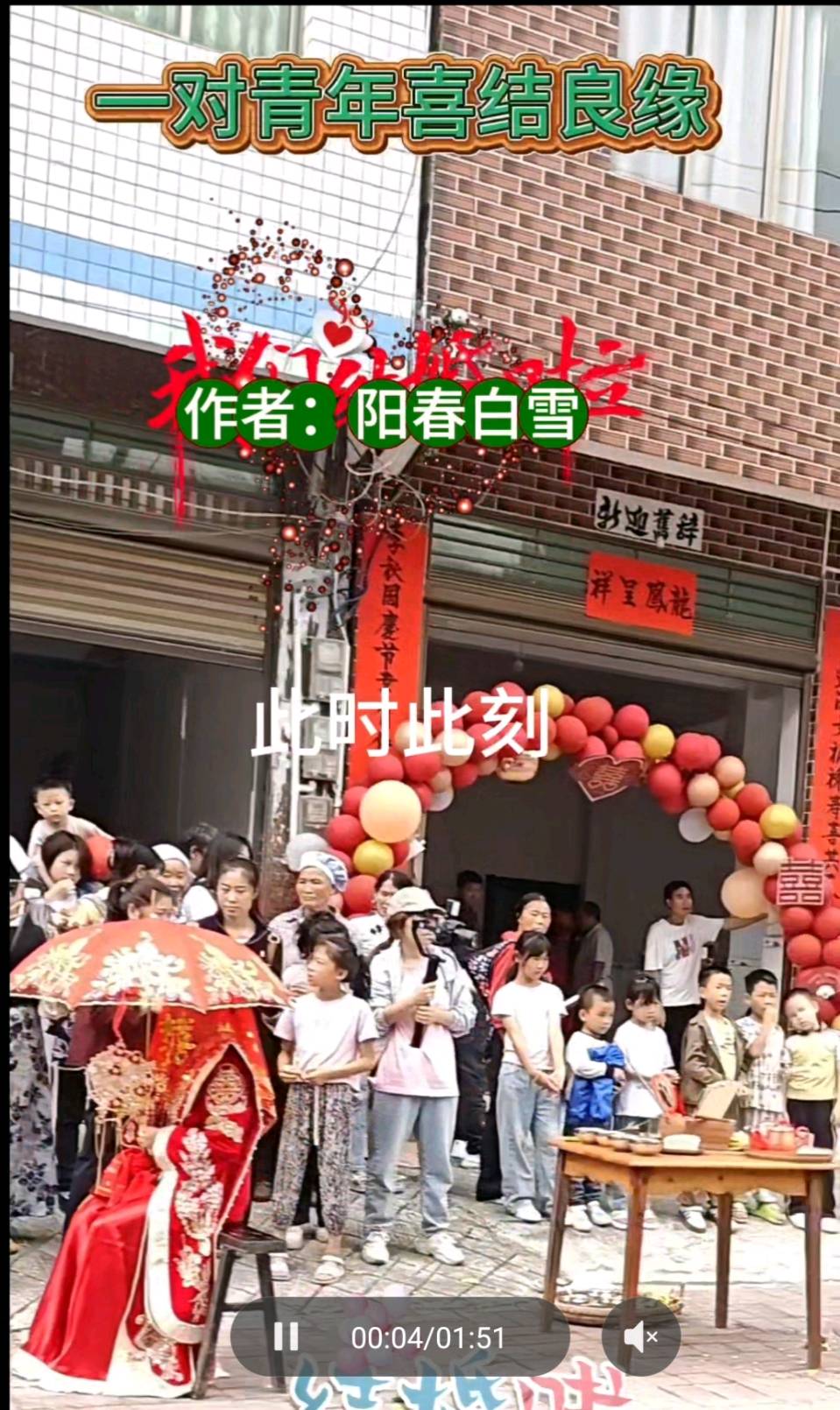 天文小镇有一对男女青年,他们距离十多公里远,出门打工去挣钱,互相认织后有些情感,经过交往多年,情投意合情真意切,十月四日这天,终于喜结良缘,了却了双方老人的一桩心愿,大家都喜地欢天。