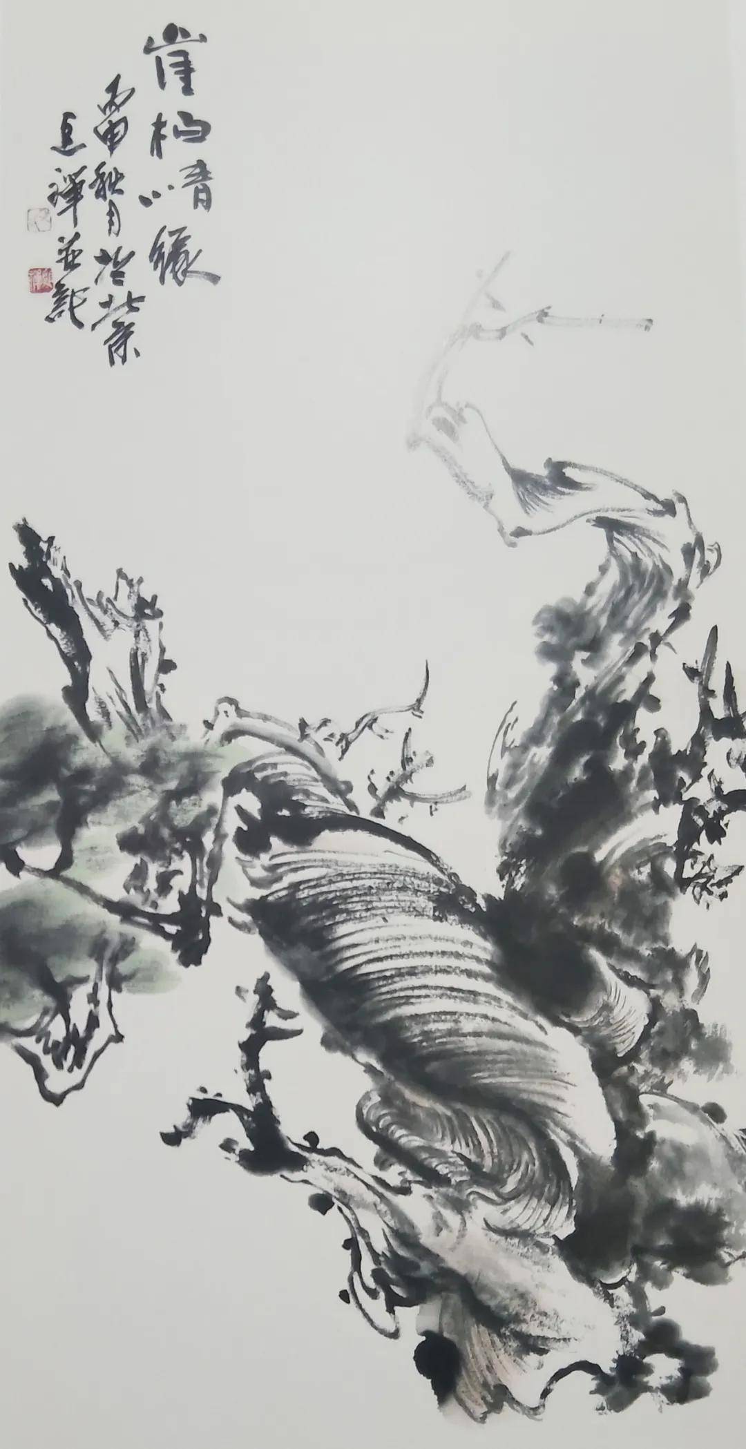 细观画册中的作品,《孤柏吟风》以焦墨表现风蚀纹理,背景晕染似雾霭,传递出"枯木逢春"的哲学思考与对生命韧性的礼赞;《共生》则通过崖柏根系与山石的交融刻画,暗喻人与自然的互联关系,彰显当代创作者的生态关怀。这种"融入创作意识、传承传统文脉"的创作理念,恰是对"笔墨当随时代"的生动诠释——既延续了文人画"重意轻形"的精神内核,以主观之意写万物之神;又通过对现实生活的关注注入时代活力,让尺牍之间的逸笔草草生长出现实温度。