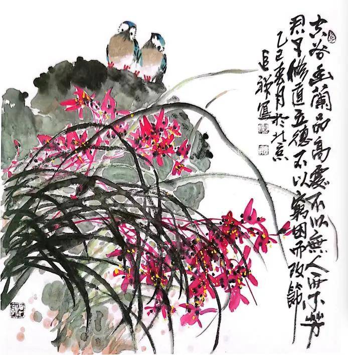 梁建甫别署"追禅","追禅惜缘、亲和自然"是其艺术信条。他善于在笔墨中明心见性,在丹青里参禅悟道。读他的画,有自然之美,那是花儿绽放的娇艳、鸟儿飞翔的自由;有寻常之禅,那是在平凡生活中对生命的敬畏与感恩;有诗意之境,那是心灵在艺术海洋中自由翱翔。