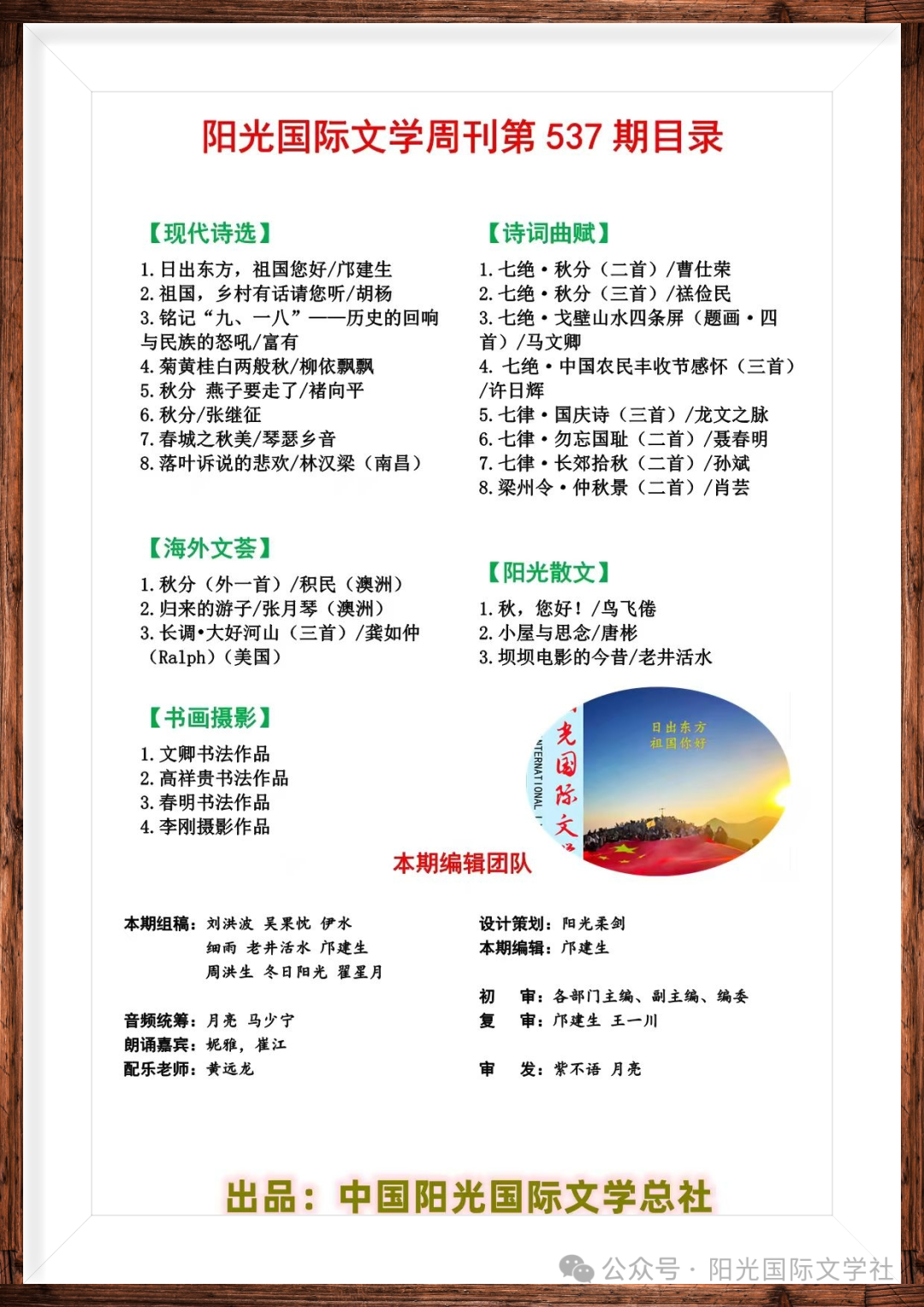 阳光国际文学社【阳光国际文学社团】是以《阳光文学》主要微刊为载体的专门征稿基地。创建【阳光文化】微刊纯文学作品,陶冶情操,养精蓄锐,锻造本领,在实现自我展示,自我欣赏的同时,把文学创作成果与大家分享,对中国文学的发展做出积极努力!443篇原创内容公众号喜欢请给我双击关注哦