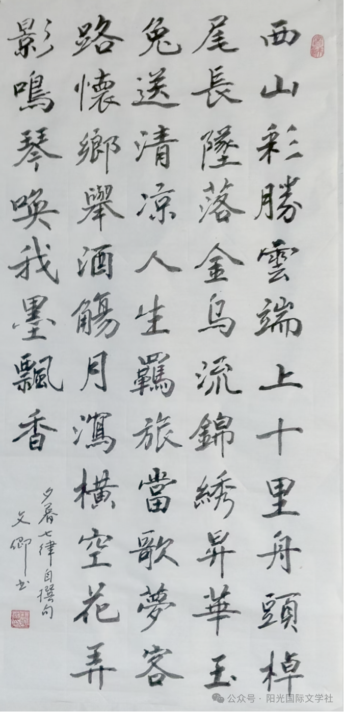文卿,姓名:马延国,1952年出生,山东滕州人。自幼喜好文学,更爱书法,笔耕不辍。人近夕阳下,不负韶华时,进入蓝星公益诗院学习诗词创作。书法诗词均在今日头条,视频号等许多家个媒体中发表。诗词在2023年度“华夏杯”荣获成绩优秀奖。