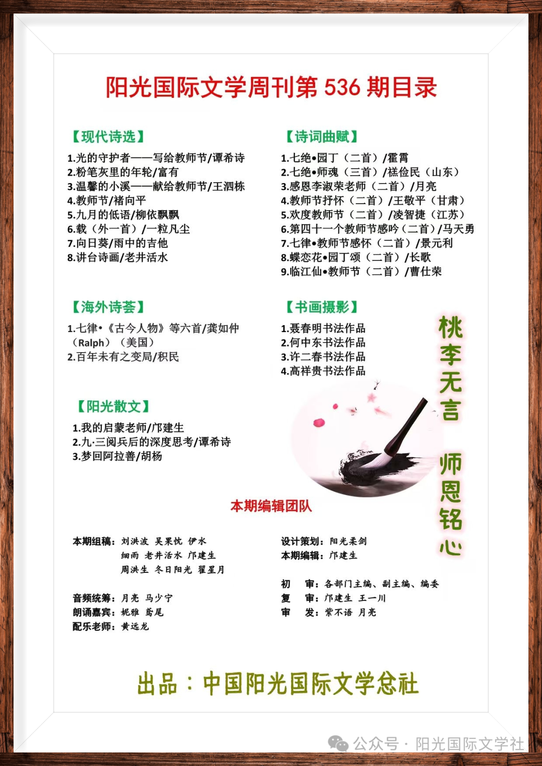 热烈祝贺阳光国际文学周刊发刊第536期