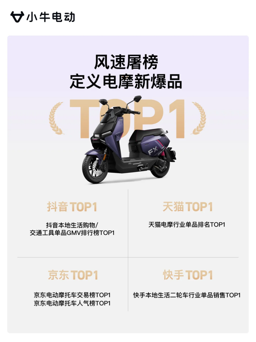 2025年9月28日19:00,全球高端智能电动车领导品牌小牛电动新品电摩FX风速在抖音、天猫、京东、快手等多平台同步开启首发。首发仅5小时,其全渠道销售额便突破6830万元,销量达到14252台,这一成绩不仅延续了小牛电动过往新品“首发即热销”的市场表现,更以“四大平台同步霸榜”的态势,对电摩行业传统性价比标准形成冲击。