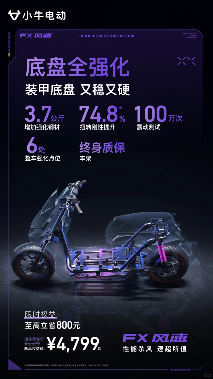 结果小牛FX风速版直接打破了这种“将就”,来了个“配置平权”:跟九号M5用的是“同款车架”!但在价格方面,小牛电动FX风速版“4K”开头,九号M5125则定价在1.3W,差了3倍还多。也就是说,你花1/3的钱,就能拿到和万元车一样的车架稳定性,更强的动力体验,小牛电动这波性价比直接拉满。