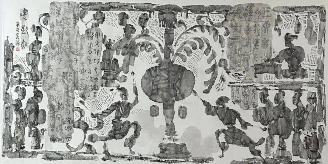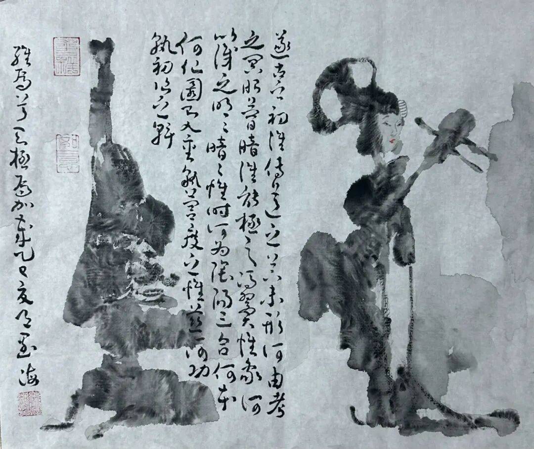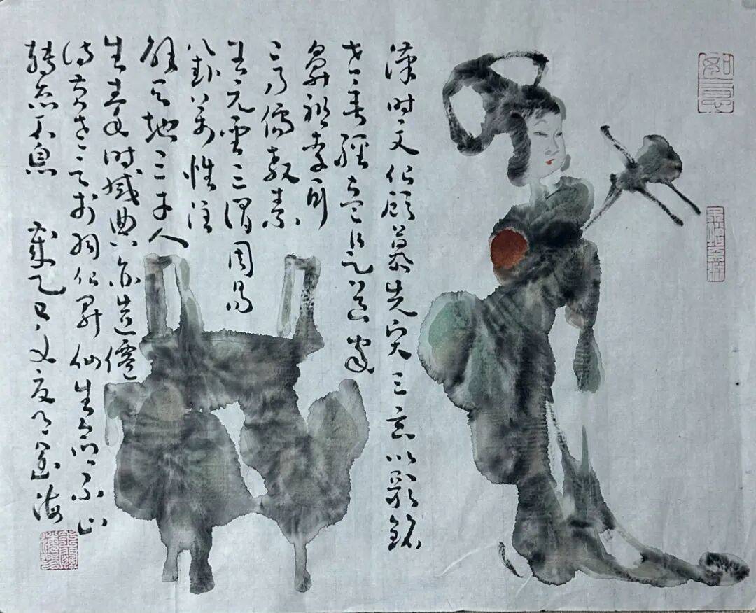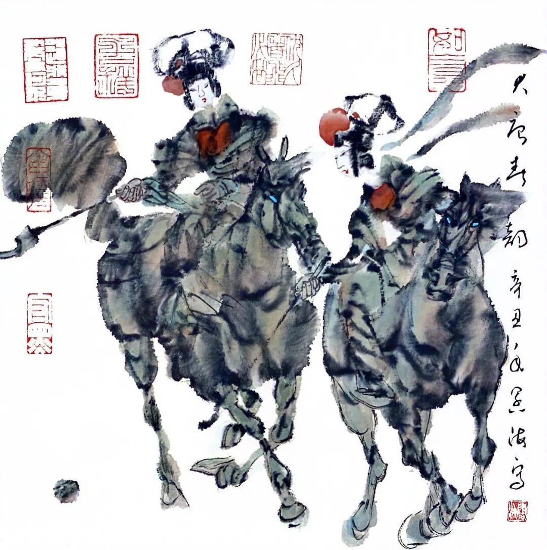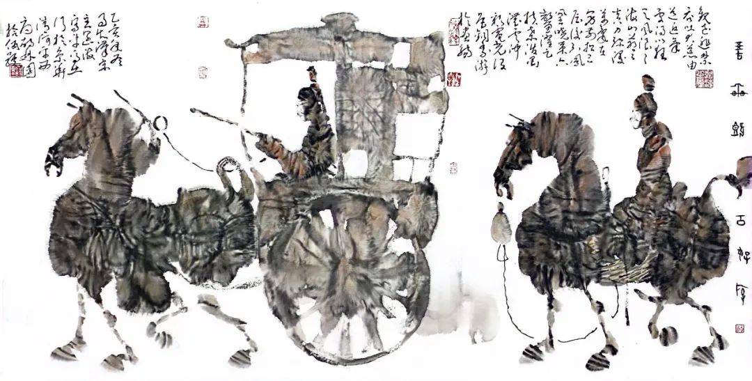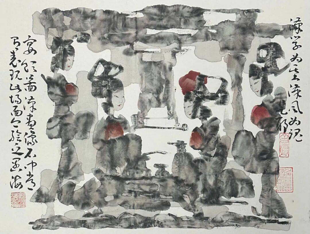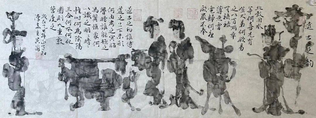 当代文化之回归表现在中国画方面就是向传统古文人画的回归。王阔海先生作为一位开宗立派的一代宗师,在中国画大写意绘画领域做出了巨大贡献。在他的新汉画作品中首先映入我们眼帘的是那文人画通透、明净的富有诗意的笔墨意境和骨法用笔的书卷之气。这在先生所创作的《车马出行》《丽人行》《屈子天问》古人物与彩陶、青铜器组合的画面中,我们都会感受到当代文人画的隽永与典雅,书法用笔线条的猷劲与内涵,侍统文化的深度、广度与温度。每幅作品都承载着丰富的文化内涵和时代的人文精神。这不仅反映出他学贯中西深厚的文化素养,也体现了他对传统文化深刻的理解以及与当代文化的融合与弘扬。