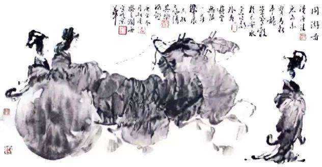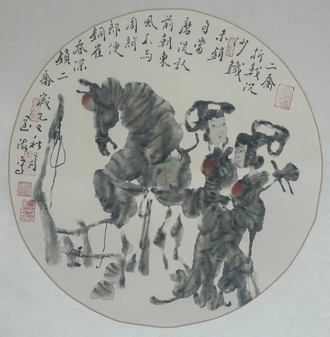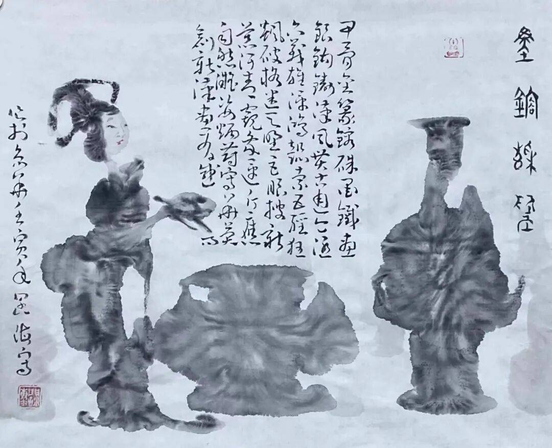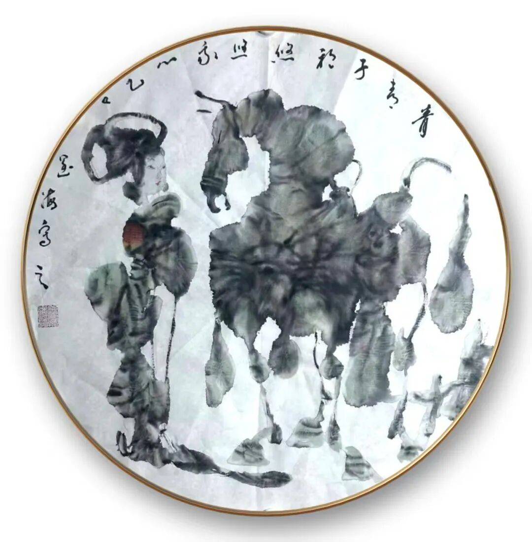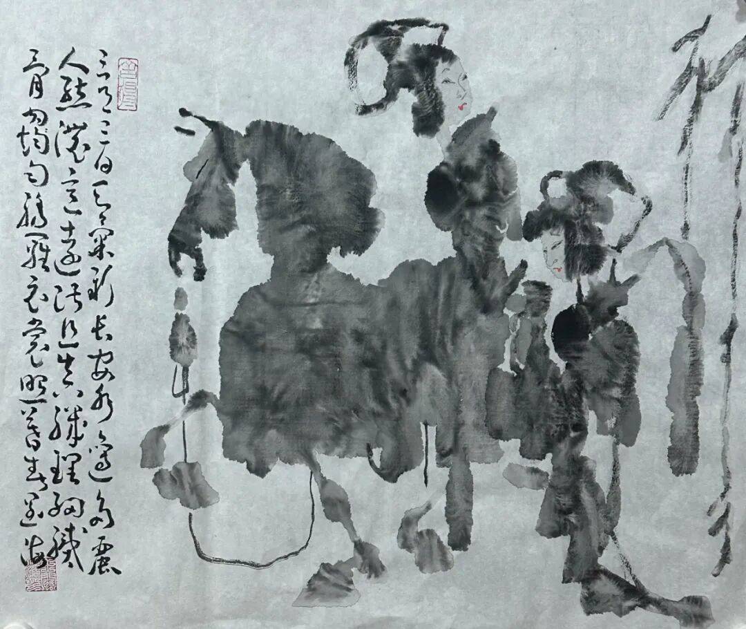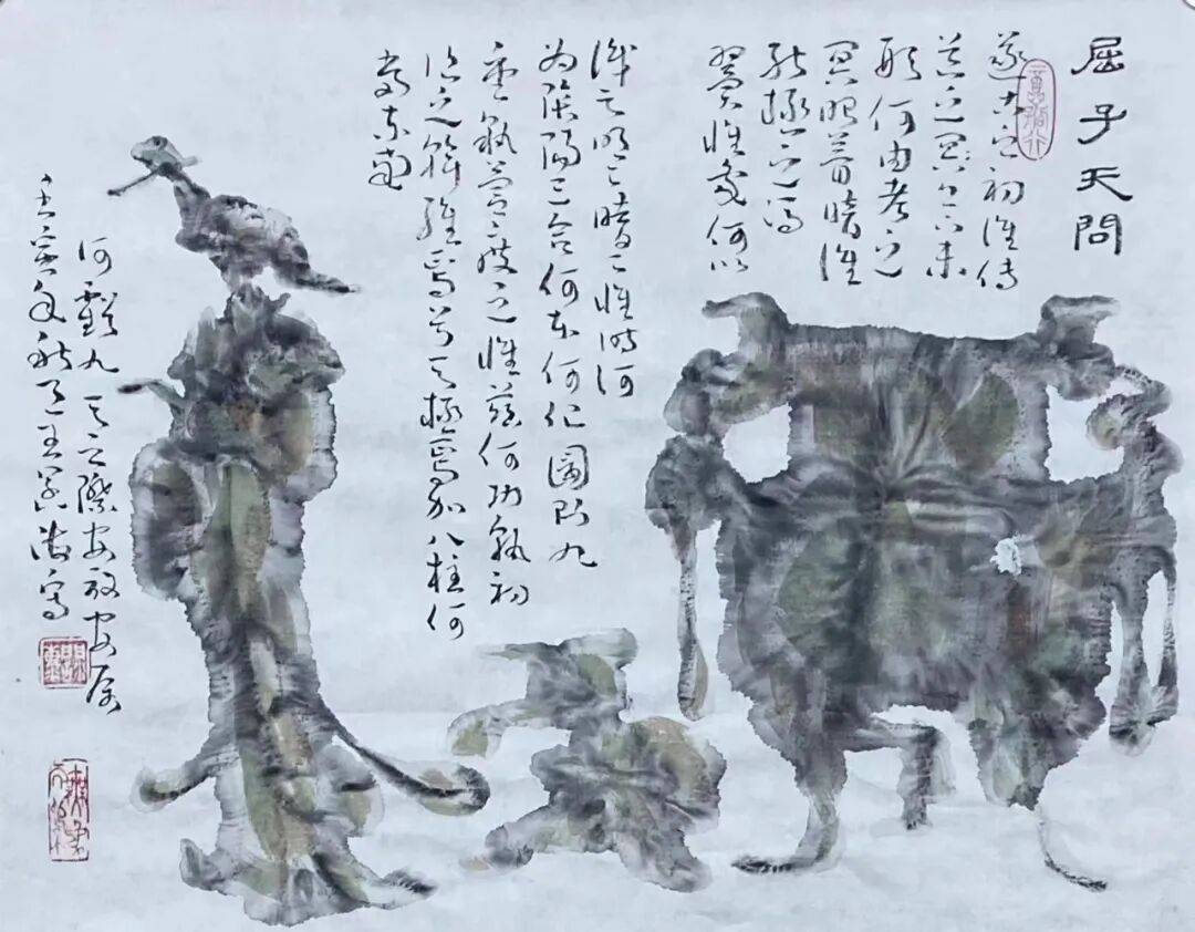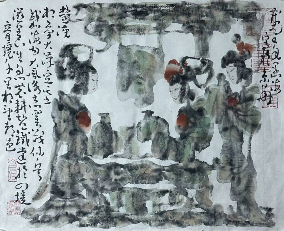 当代文化之回归表现在中国画方面就是向传统古文人画的回归。王阔海先生作为一位开宗立派的一代宗师,在中国画大写意绘画领域做出了巨大贡献。在他的新汉画作品中首先映入我们眼帘的是那文人画通透、明净的富有诗意的笔墨意境和骨法用笔的书卷之气。这在先生所创作的《车马出行》《丽人行》《屈子天问》古人物与彩陶、青铜器组合的画面中,我们都会感受到当代文人画的隽永与典雅,书法用笔线条的猷劲与内涵,侍统文化的深度、广度与温度。每幅作品都承载着丰富的文化内涵和时代的人文精神。这不仅反映出他学贯中西深厚的文化素养,也体现了他对传统文化深刻的理解以及与当代文化的融合与弘扬。