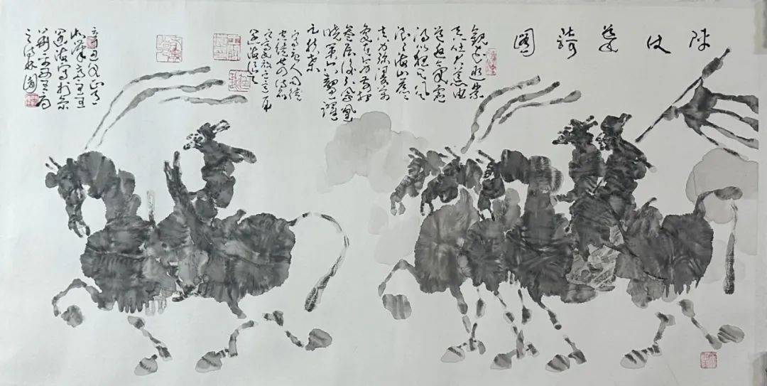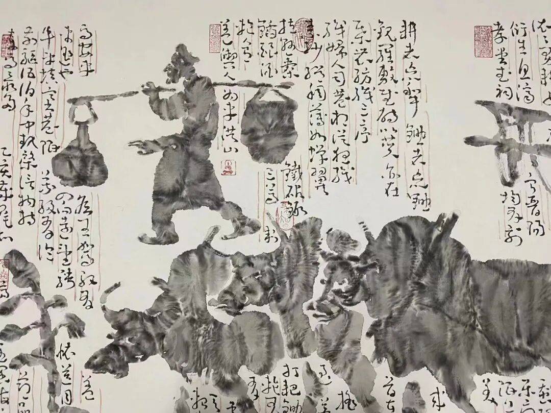 新汉画作品描绘出了古人立体的感觉,且相当有力度感。这种立体感的表现,是王阔海对绘画多种技法的深入研究和精湛技艺的彰显。他通过玄妙的笔墨肌理的笔触和巧妙的泼墨构图,加结实的形体塑造,使得其人物跃然纸上,仿佛触手可及,磅礴大气、使豪迈奔放雄强的大汉气象、雄浑之感扑面而来。