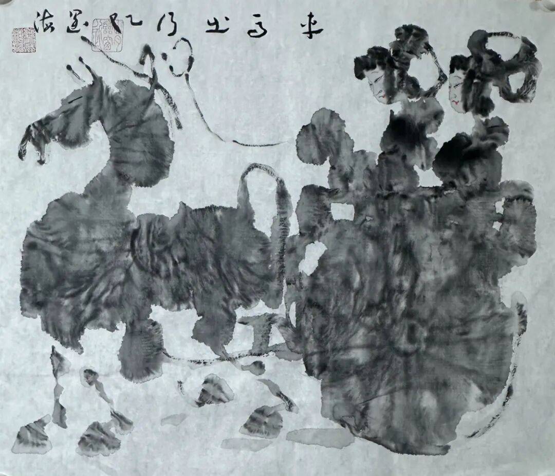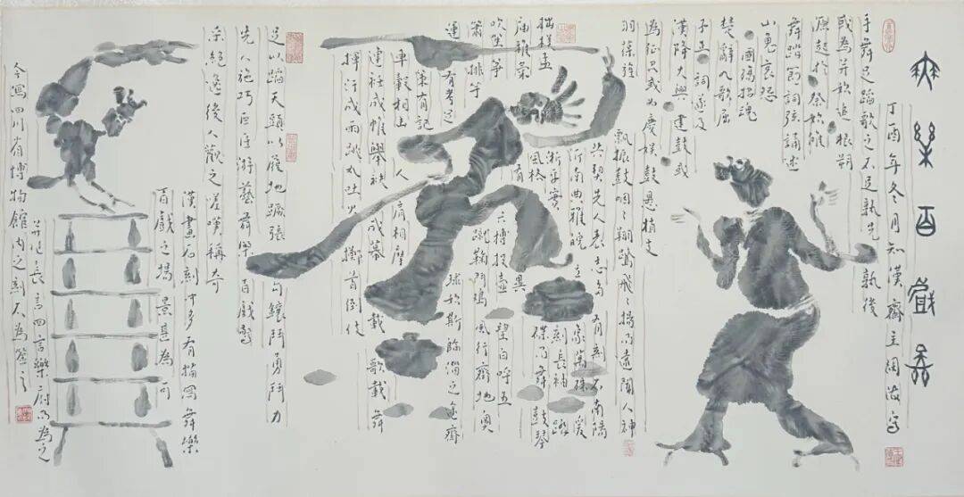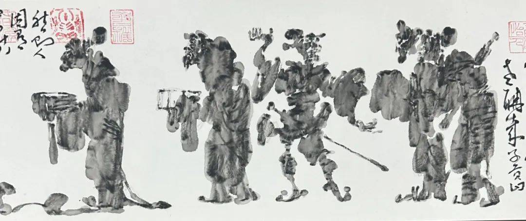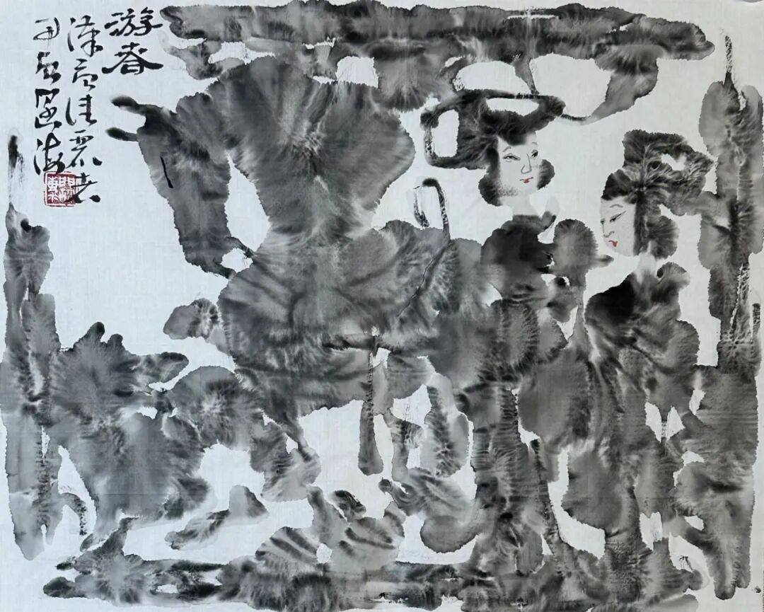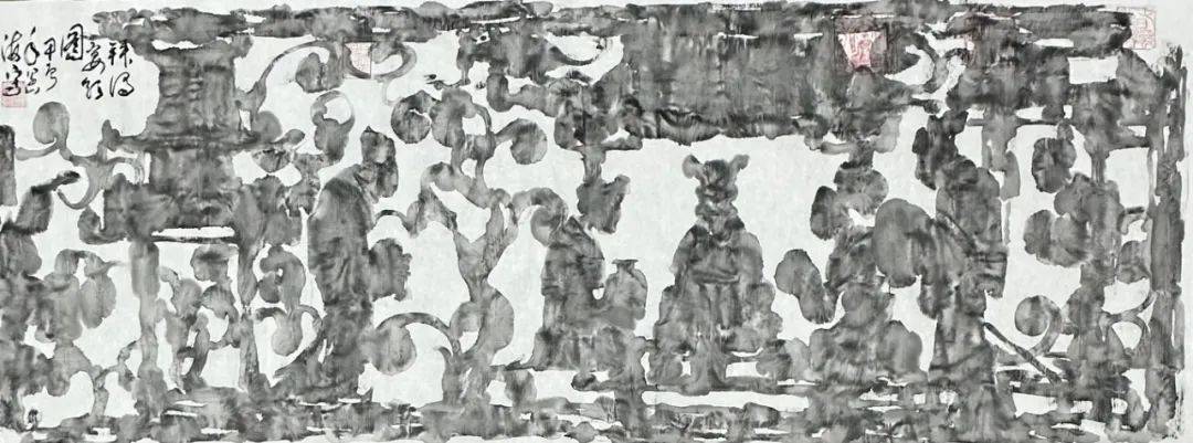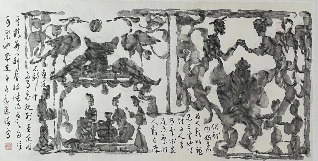 在新汉画中王阔海巧妙地点缀了特技泼墨,这一细节的处理使得画面更加生动有趣,人物的活跃与背景的静谧形成了鲜明的对比,展现了新汉画的生机与活力。这种匠心独运的构思,体现了王阔海对画面的精心布局和对细节的极致追求。