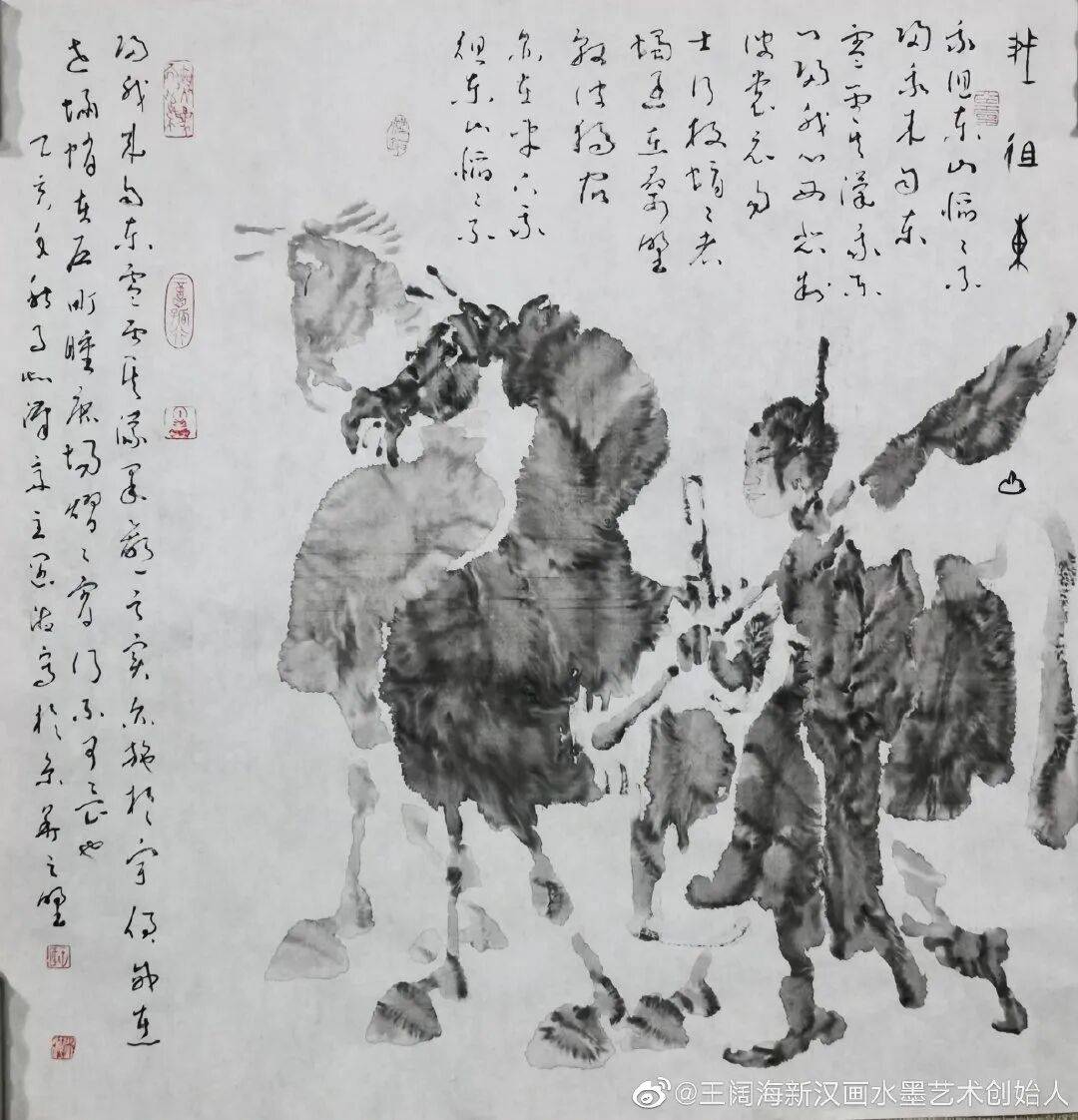 王阔海先生的新汉水墨艺术形式新颖,风格独特。不同于古人,有别于前人,更独立于今人。这使得他的作品辨识度极高;在二十米开外不用看落款盖章就知道是王阔海的!而且是远看有自己的样貌,近看有自己的符号!这真是太难得了!当下专用操作而成名的所谓大家画风东拼西凑的多,摩肩接踵互相靠的多,粘糊在一起分不清面目的太多太多,象王阔海先生这样独立特行的艺术风格真是少之又少!这使他的作品在当今画坛中独树一帜,备受瞩目。他的新汉画不去重复生活,而是用哲学思辨提升生活,使之成为文心而灿的画魂独创。