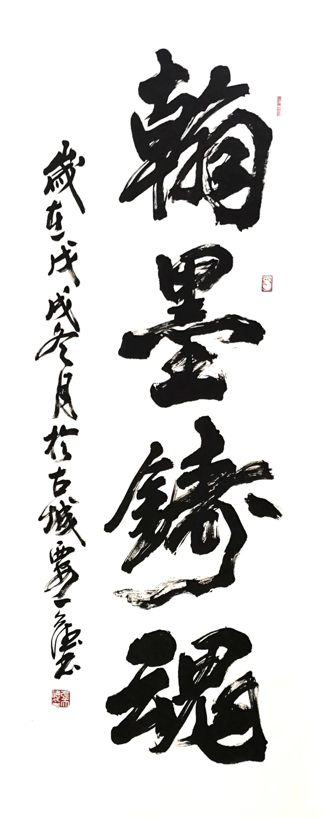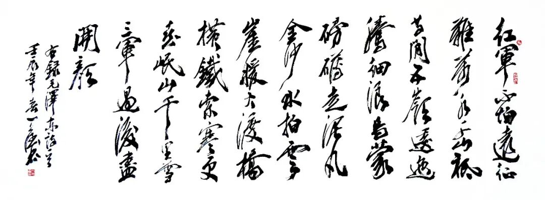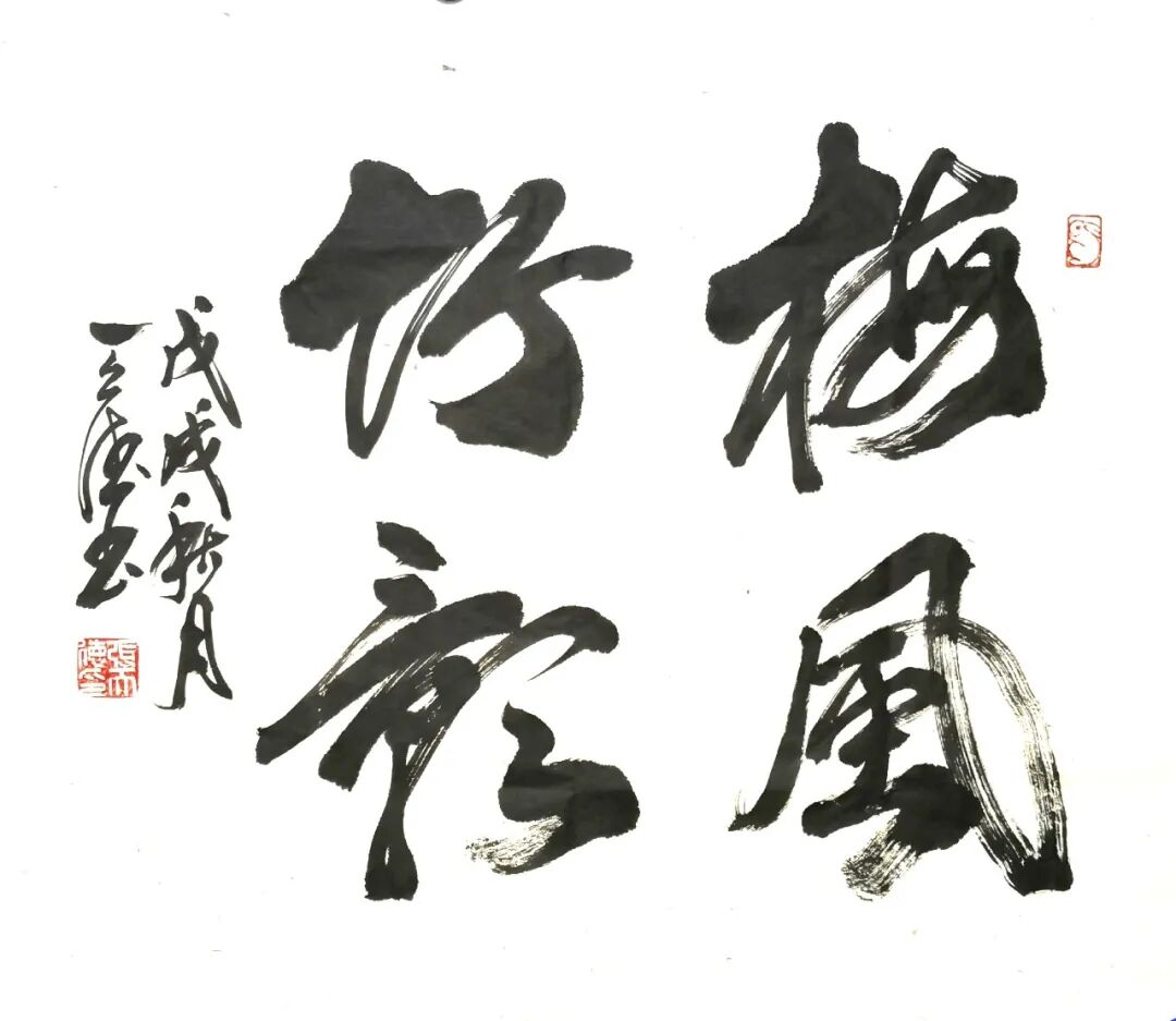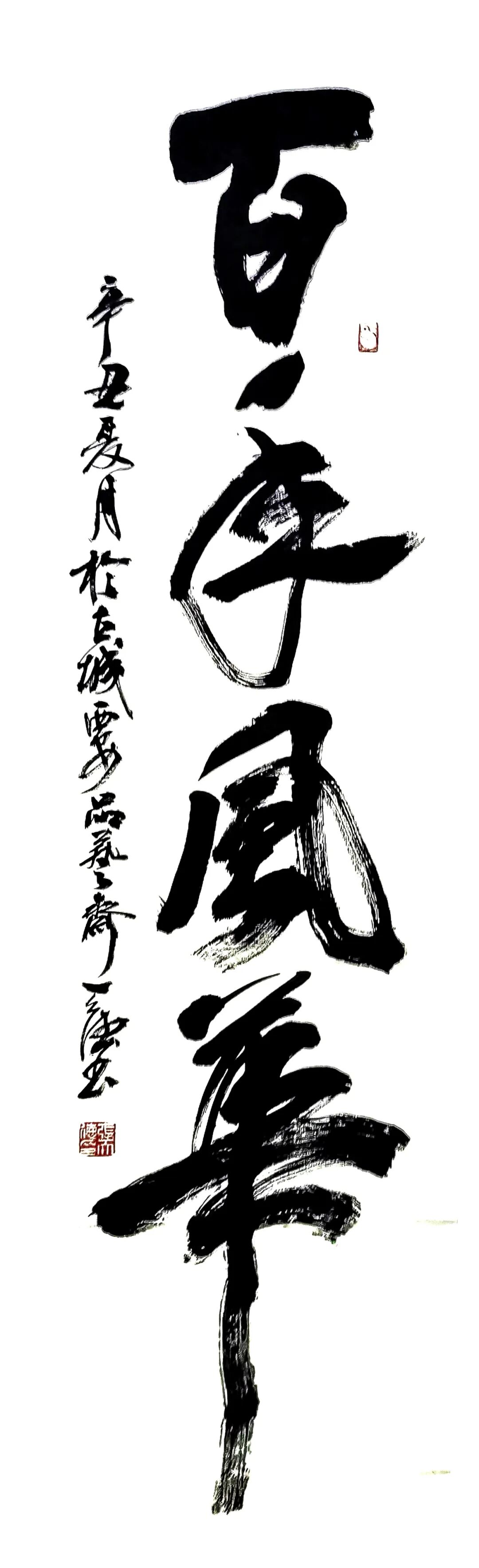他的书法雄厚浑然,但是笔路清晰,大书雄风从来不失细节塑造。转折顿挫皆循法度,显然是精通晋韵唐法的卓越修为。用笔精湛,细节清楚,毫不含糊,他的书法有修得真诀的非凡表现力,与那些只讲外表粗犷,不制内涵儒雅的江湖书法,完全划清了界限。这就是他经由数十年的碑帖磨砺,把晋韵唐法与北朝碑风融为一体的非凡造诣。