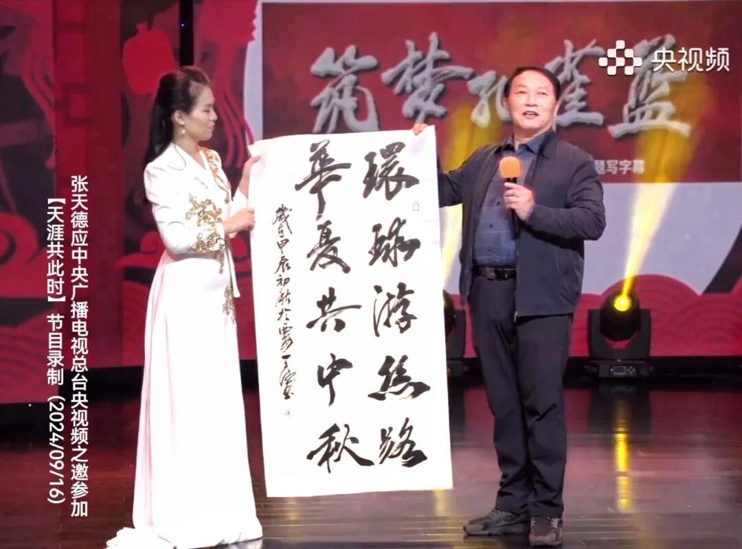中国教育电视台(CETV1)“2025丹青盛典”书画春晚特邀嘉宾,应邀参加环球旅游频道(GTTV)《天涯共此时》——“欢度中秋·喜迎国庆”书画特别节目及其与美国华尔街卫视联合主办的“蛇年贺岁·翰墨迎春”2025首届全球名家春晚节目录制并现场采访,在广西三月三应邀接受中央广播电视总台央视频“为祖国放歌”大型活动《名人说》专访报道,多次应邀参加陕西师范大学手写录取通知书开笔仪式并现场接受采访。出版有《实用硬笔书法艺术》《书法教程》等多部教材或专著,中国文联出版社出版《中国文艺家——张天德书画特刊》2024年第3期;为《关门弟子》《热土军魂》等多部影视片题写片名;先后为南京大学出版社、北京师范大学出版社出版的高校教材《大学语文》封面题字;艺术成就在CCTV《写意人生》、中央新影中学生频道《时代人物》《美育视界》《强国丰碑》等栏目专题报道。