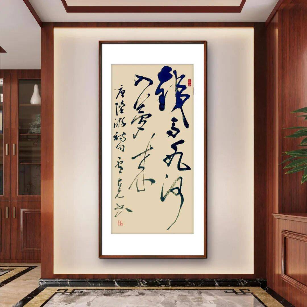 从字体风貌来看,卢占元先生尤擅草书,其笔下的草书,如奔雷坠石,似惊蛇入草,尽显狂放不羁又不失规矩法度的艺术特质。观其作品,线条的粗细、长短、曲直变化万千,却又能在跌宕起伏中保持着内在的节奏与韵律。每一根线条都仿佛被赋予了生命,或刚劲如铁,力透纸背,展现出雄健的笔力;或柔韧如丝,婉转灵动,流露出优雅的韵致。笔画与笔画之间,字与字之间,通过牵丝映带、揖让顾盼,营造出一种连绵不绝、气韵贯通的艺术效果,将草书“流而畅,狂而谨”的美学追求诠释得淋漓尽致。