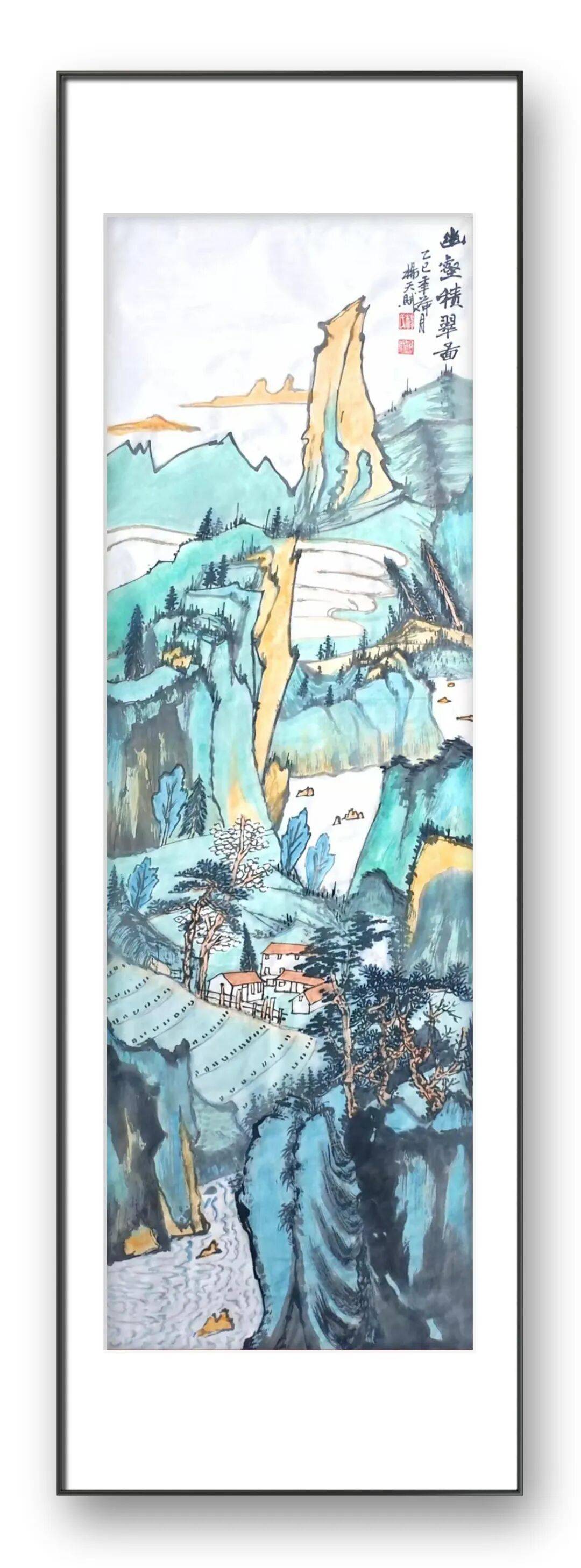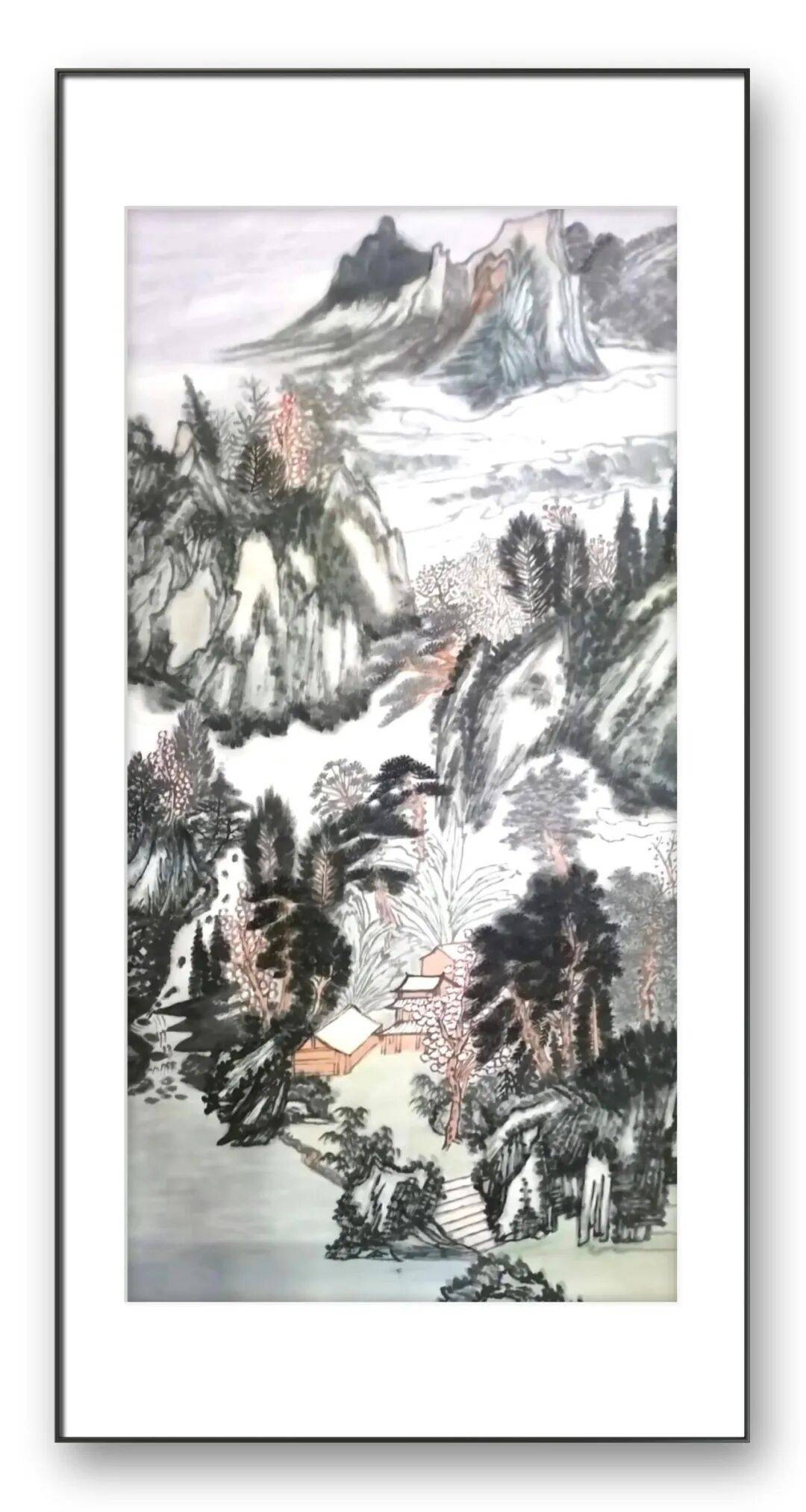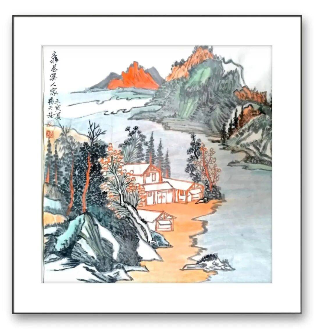 杨天赋老师的山水画,绝非对实景的刻板复制,而是融入了他对自然、生活的深刻感悟与独特精神追求。在他的画作中,屋舍是极具特色的元素,这些屋舍并非简单的建筑描绘,而是他心中的心灵栖居之所。屋舍或隐匿于茂密的林木之间,或坐落于宁静的湖畔之旁,周围环绕着青山绿水、云雾缭绕,营造出远离尘嚣、清幽静谧的氛围。这一座座屋舍,寄托着他对闲适生活的向往,传递出一种悠然自得、淡泊名利的心境,让身处现代喧嚣社会的观者,感受到一丝宁静与慰藉,引发对简单生活的思考与向往。