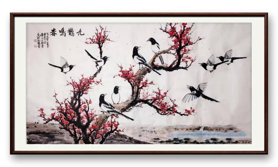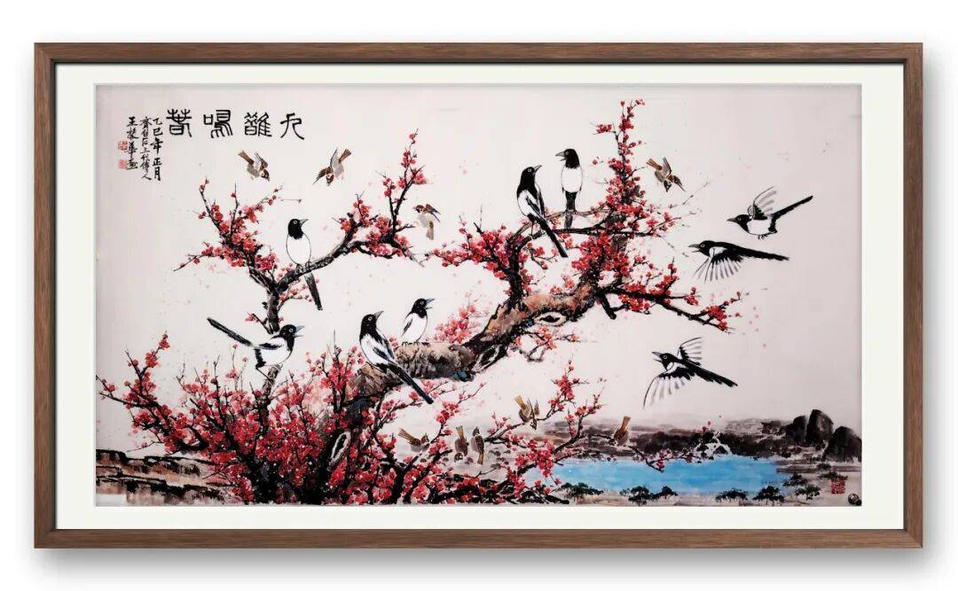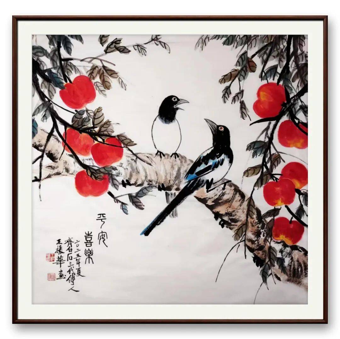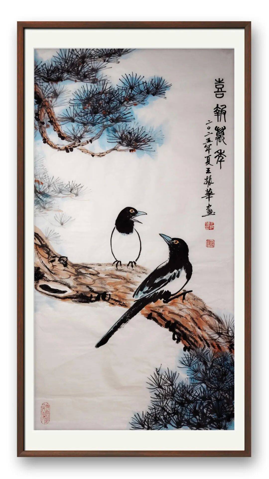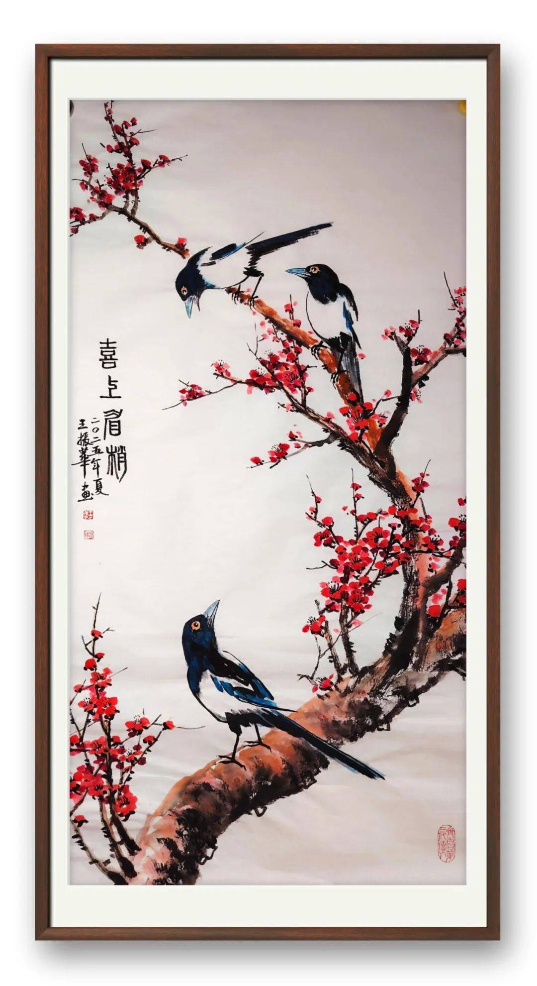在艺术创作中,喜鹊是王振华的灵魂载体。他笔下的喜鹊绝非简单复刻,而是被赋予情感与寓意。“喜鹊寿桃”图融灵动与祥瑞,赞生命美好;“鹊登高枝”寄寓进取精神;“喜上眉梢”图将喜鹊与凌霜梅花结合,把吉祥寓意与艺术美感演绎到极致。艺术评论家程义伟评价,其作品根植思想沃土,蕴含独特精神诗性,引领观者走进诗意艺术世界。