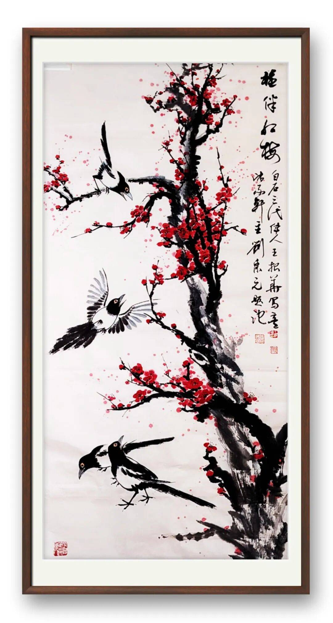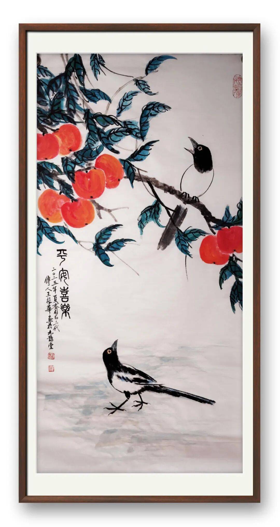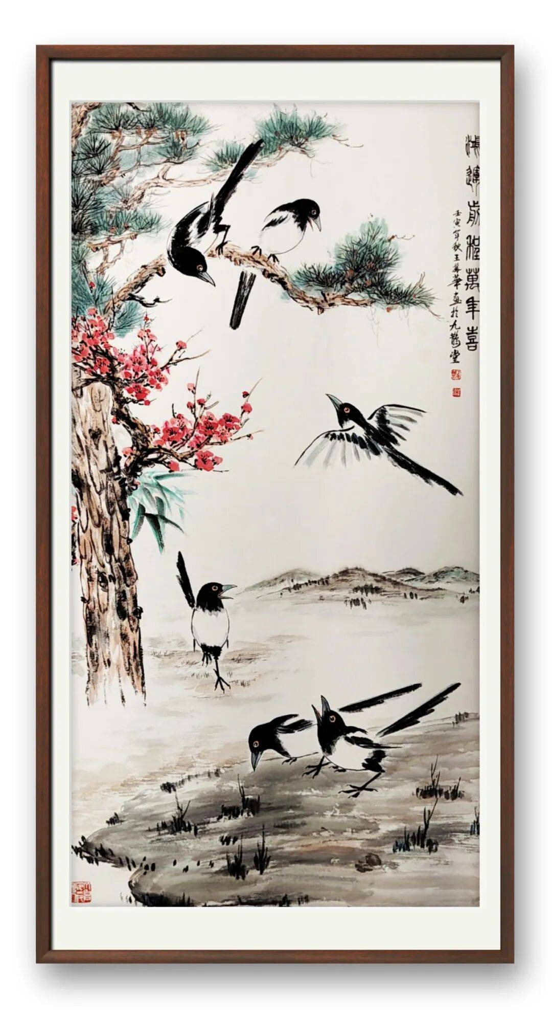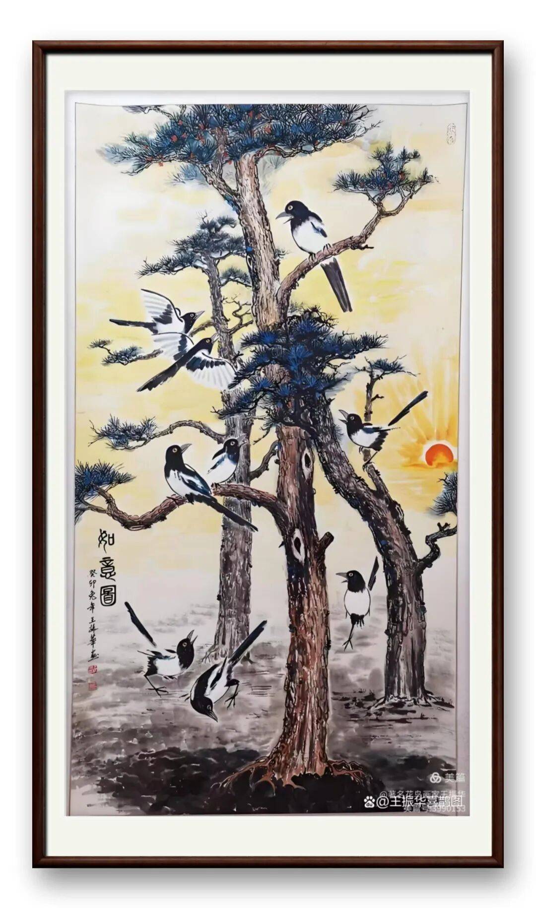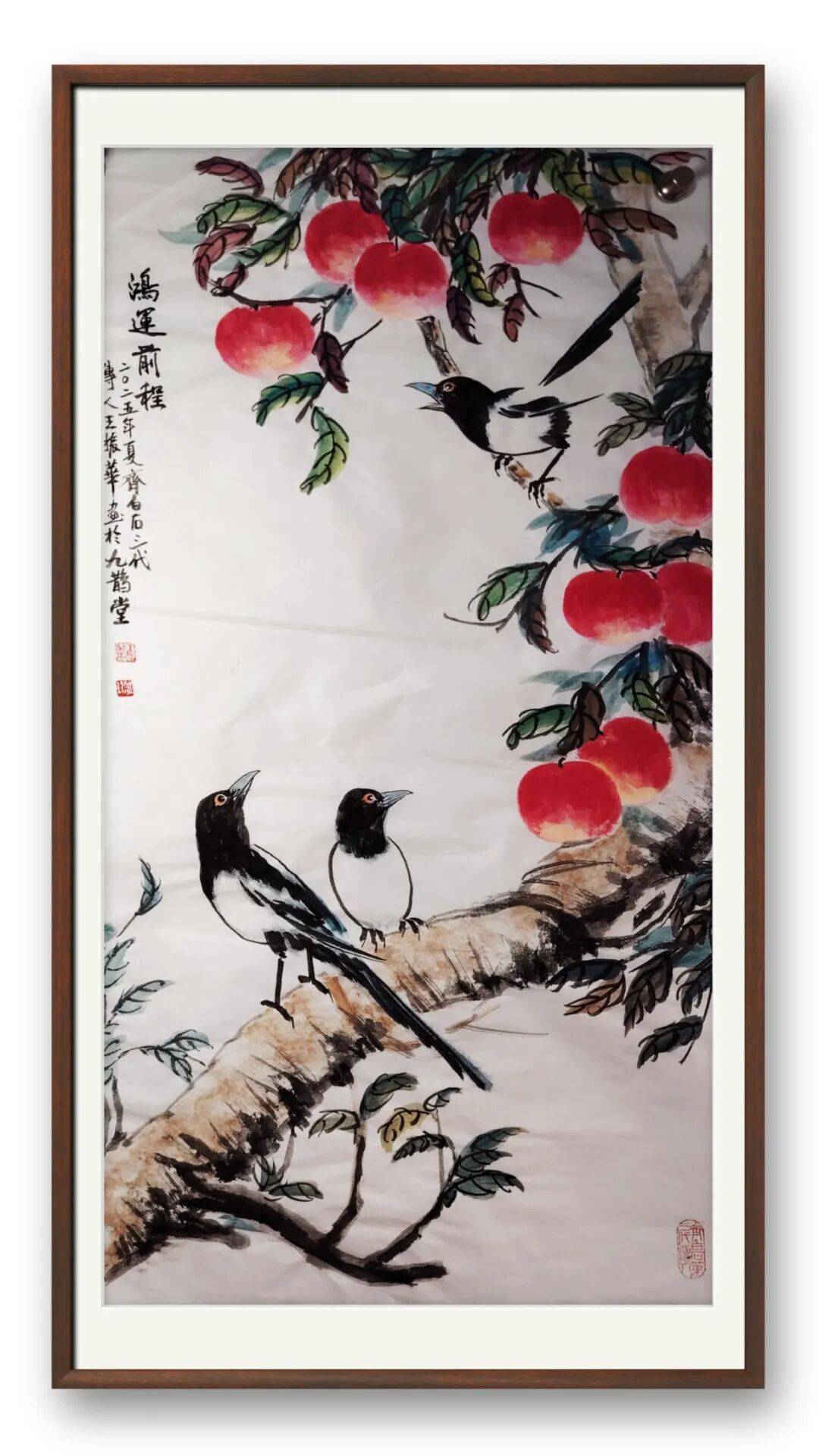 在艺术创作中,喜鹊是王振华的灵魂载体。他笔下的喜鹊绝非简单复刻,而是被赋予情感与寓意。“喜鹊寿桃”图融灵动与祥瑞,赞生命美好;“鹊登高枝”寄寓进取精神;“喜上眉梢”图将喜鹊与凌霜梅花结合,把吉祥寓意与艺术美感演绎到极致。艺术评论家程义伟评价,其作品根植思想沃土,蕴含独特精神诗性,引领观者走进诗意艺术世界。