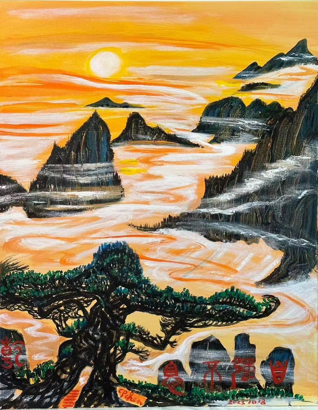 陈教授的作品题材丰富,涵盖山水、花鸟、雪景等。《秋日山峦》以暖黄为主色调,勾勒出山间路径与红树的蓬勃生机;《锦鲤桥影》墨色灵动,红鲤游弋尽显意趣;水墨《雪山》黑白交织,滑雪者的姿态传递出对极限的挑战精神;《云海松风》则以霞光云海、黄山松为景,石上 “自强不息” 的字样彰显精神追求。