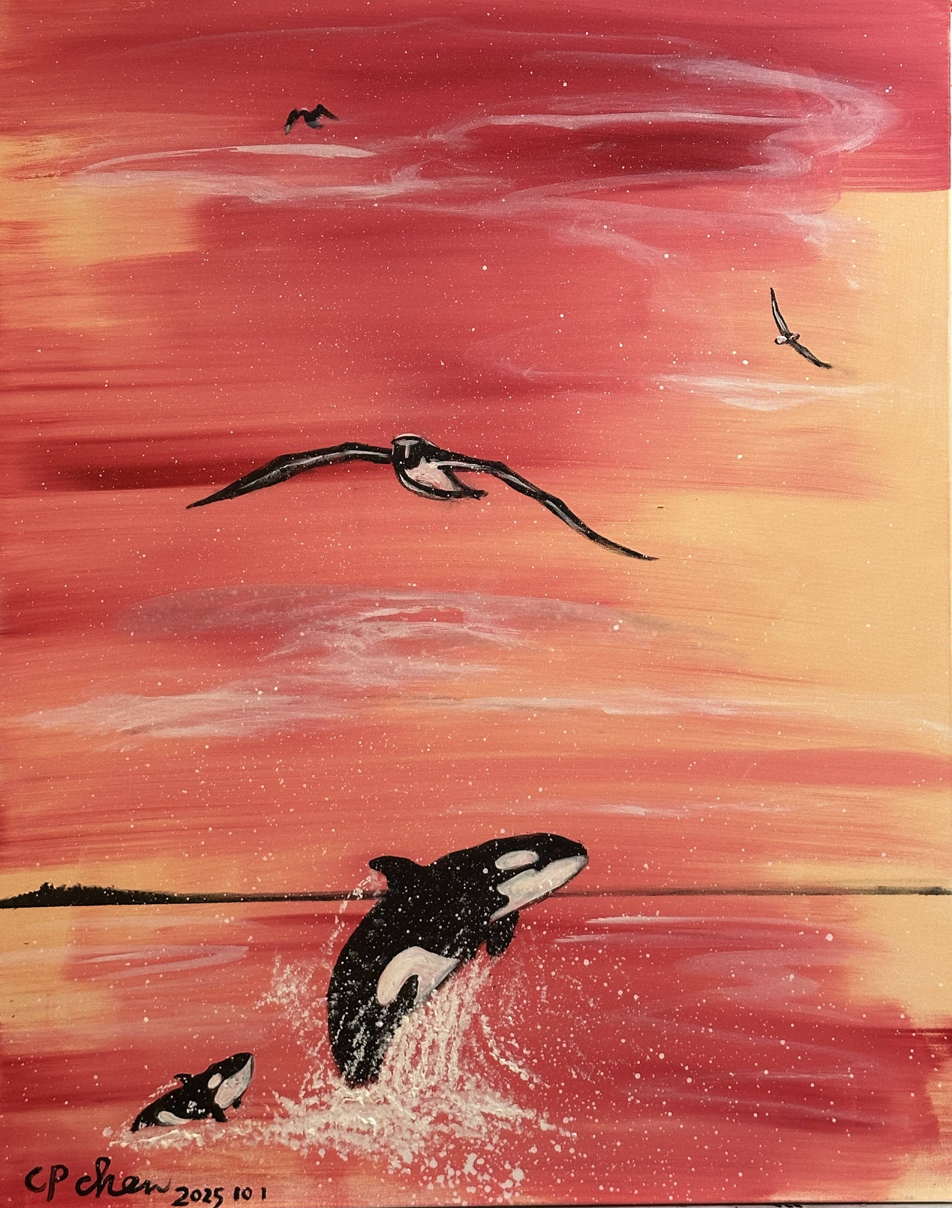 绘画系列更是以视觉张力强化哲思表达。《乾卦意象》系列画作,以浓烈的红黑配色构建出极具冲击力的画面,“乾”字与卦象符号在抽象笔触中凸显,仿佛是天地元气的视觉化迸发,隐喻着“天行健”的刚健不息;而《海阔天空》中,虎鲸于晚霞中腾跃的场景,以自然生命的蓬勃姿态,具象化了“自强不息”的生命韧性,画面色彩的暖调渐变与生物的动态张力,传递出对“健行”之道的诗意理解。