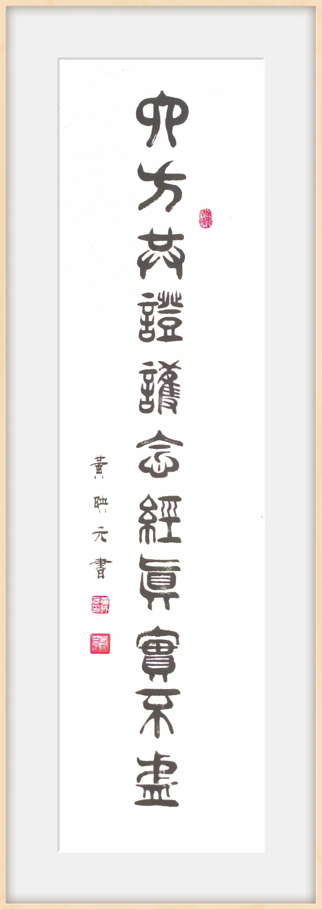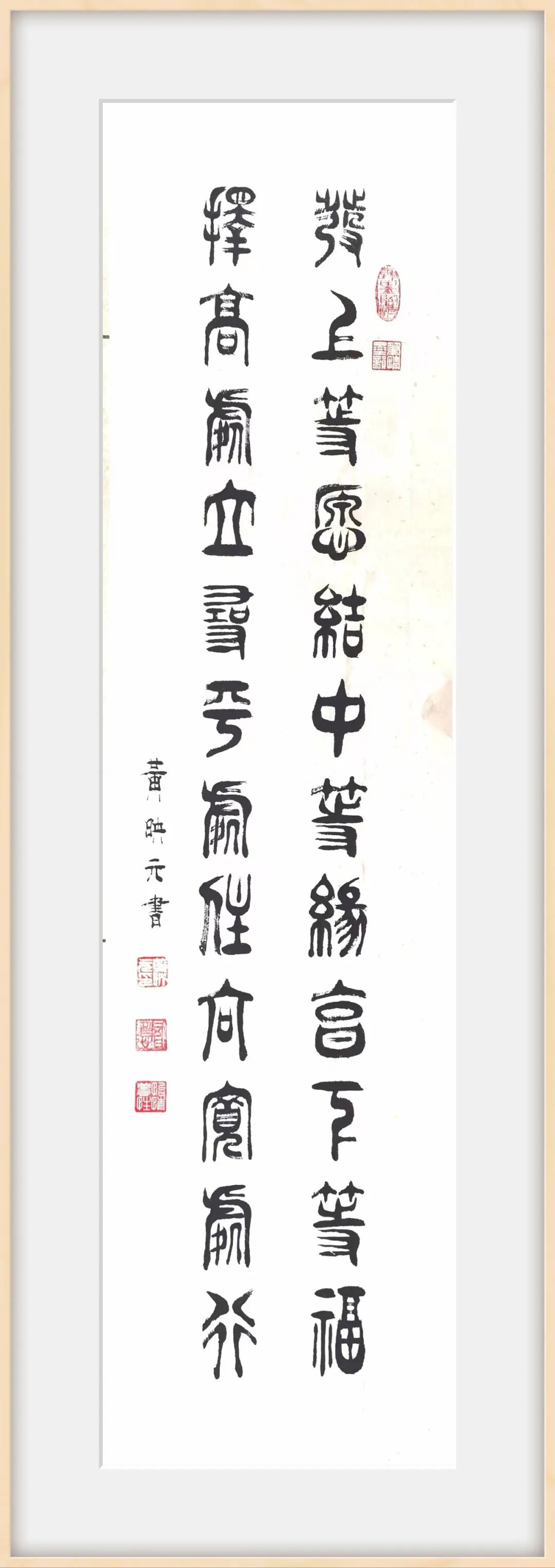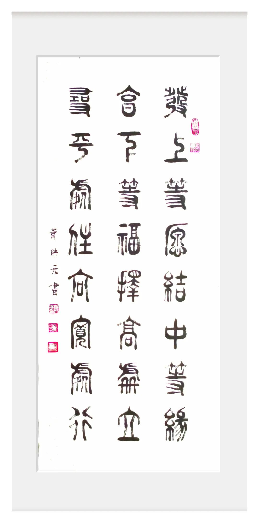 篆书作为一种古老而庄重的书体,承载着中华民族千年的文化积淀。在文化复兴的全新时代里,黄映元先生的篆书艺术不仅具备极高的文化弘扬价值,还拥有极强的装饰性,能够美化现代人的生活环境,成为当代美学的琼花玉蕊。黄映元先生的篆书以穿越时空的文化使者,将传统艺术之美引入现代文化生活空间,使人们能够感受到古典的宁静高雅。《书论》亦论:夫书者,玄妙之技也,若非通人志士,学无及之。黄映元先生的作品,以通人之法与志士之功为加载,不仅能够装点居室增添文化气息,还能陶冶人们的文化情操,使心灵得到净化升华。