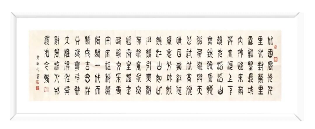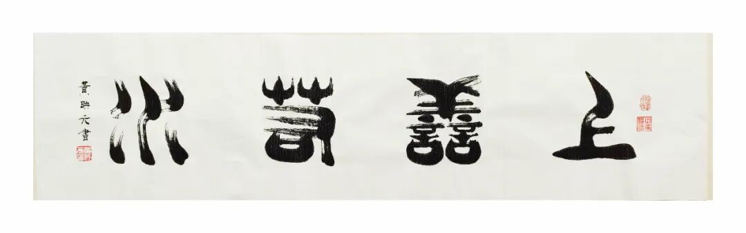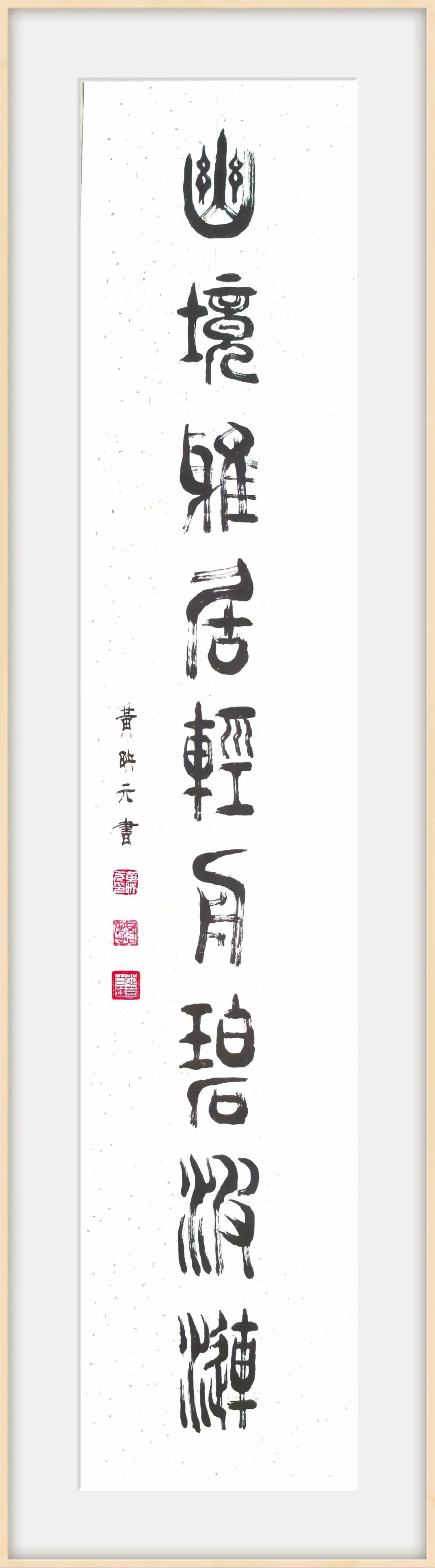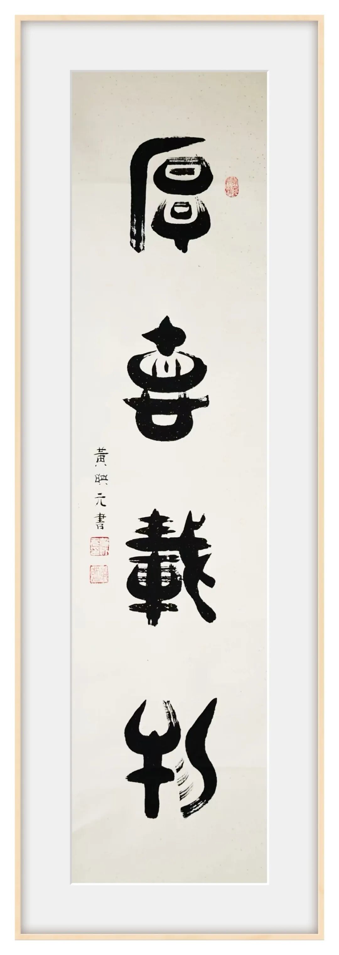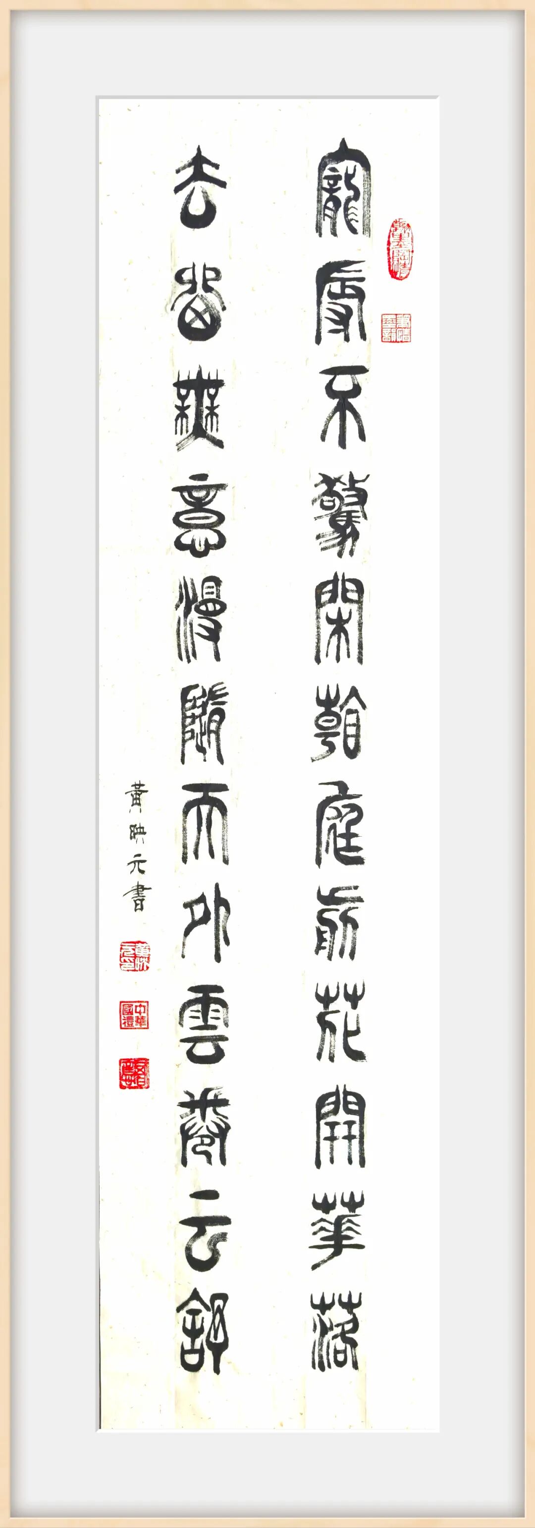 篆书作为一种古老而庄重的书体,承载着中华民族千年的文化积淀。在文化复兴的全新时代里,黄映元先生的篆书艺术不仅具备极高的文化弘扬价值,还拥有极强的装饰性,能够美化现代人的生活环境,成为当代美学的琼花玉蕊。黄映元先生的篆书以穿越时空的文化使者,将传统艺术之美引入现代文化生活空间,使人们能够感受到古典的宁静高雅。《书论》亦论:夫书者,玄妙之技也,若非通人志士,学无及之。黄映元先生的作品,以通人之法与志士之功为加载,不仅能够装点居室增添文化气息,还能陶冶人们的文化情操,使心灵得到净化升华。