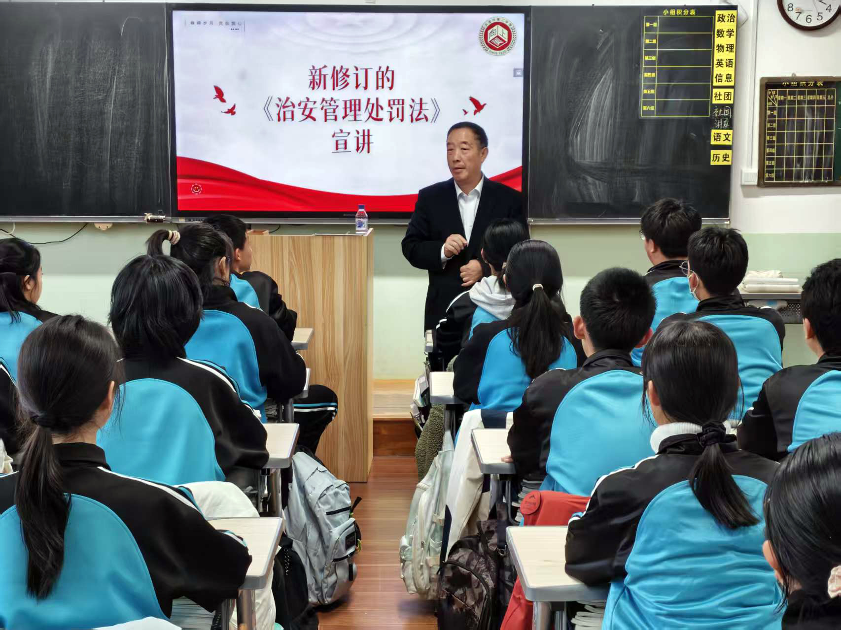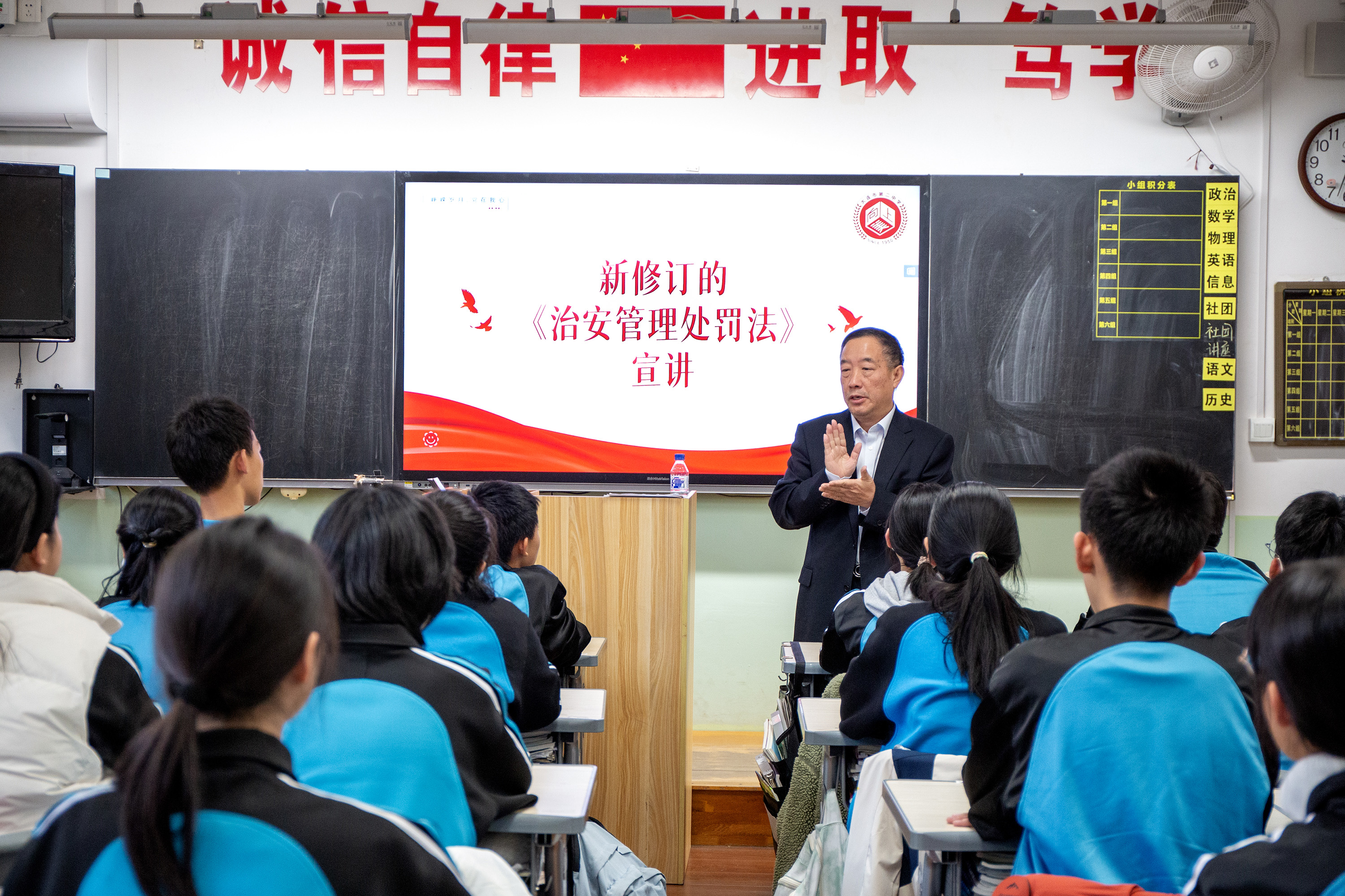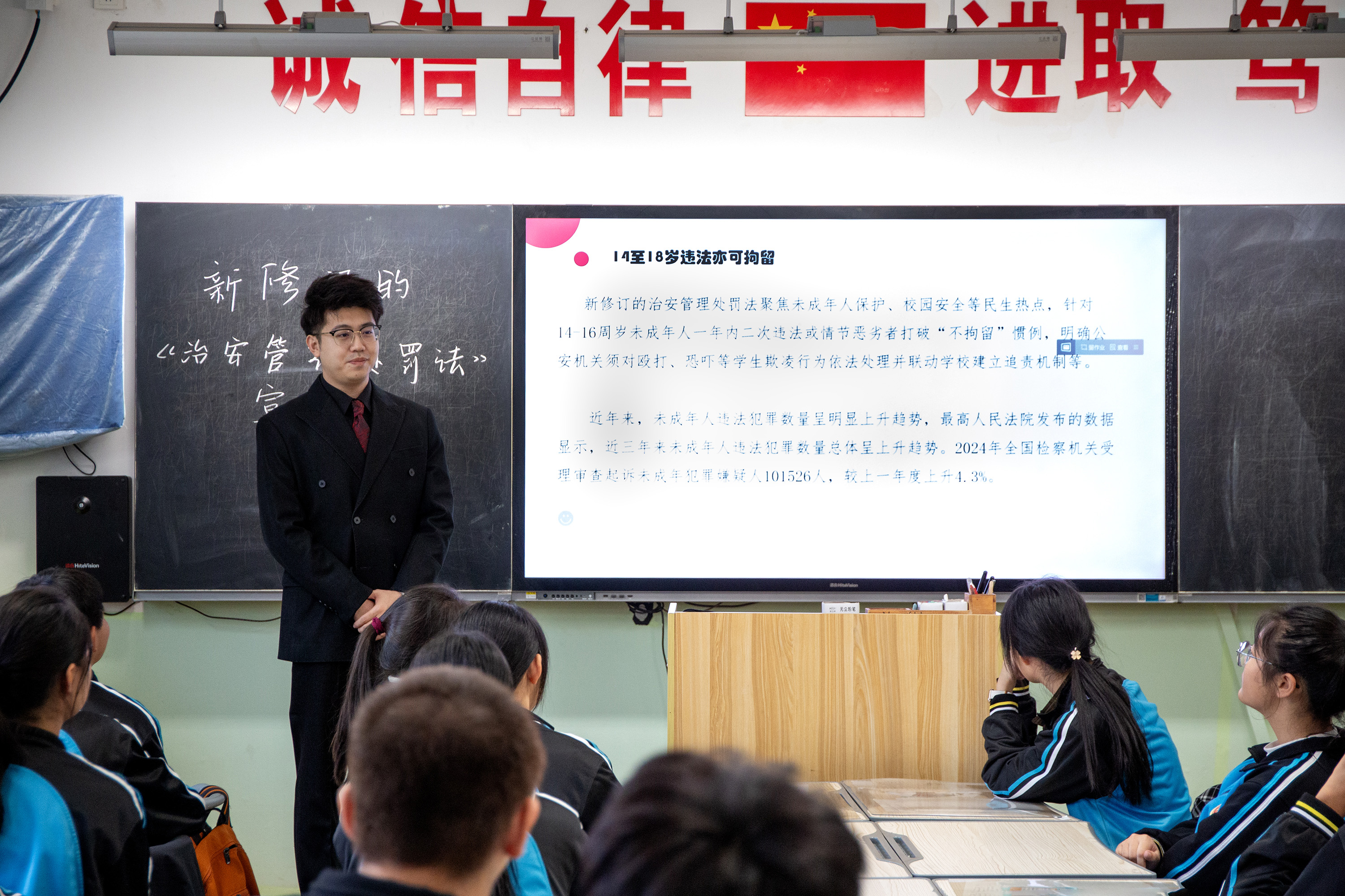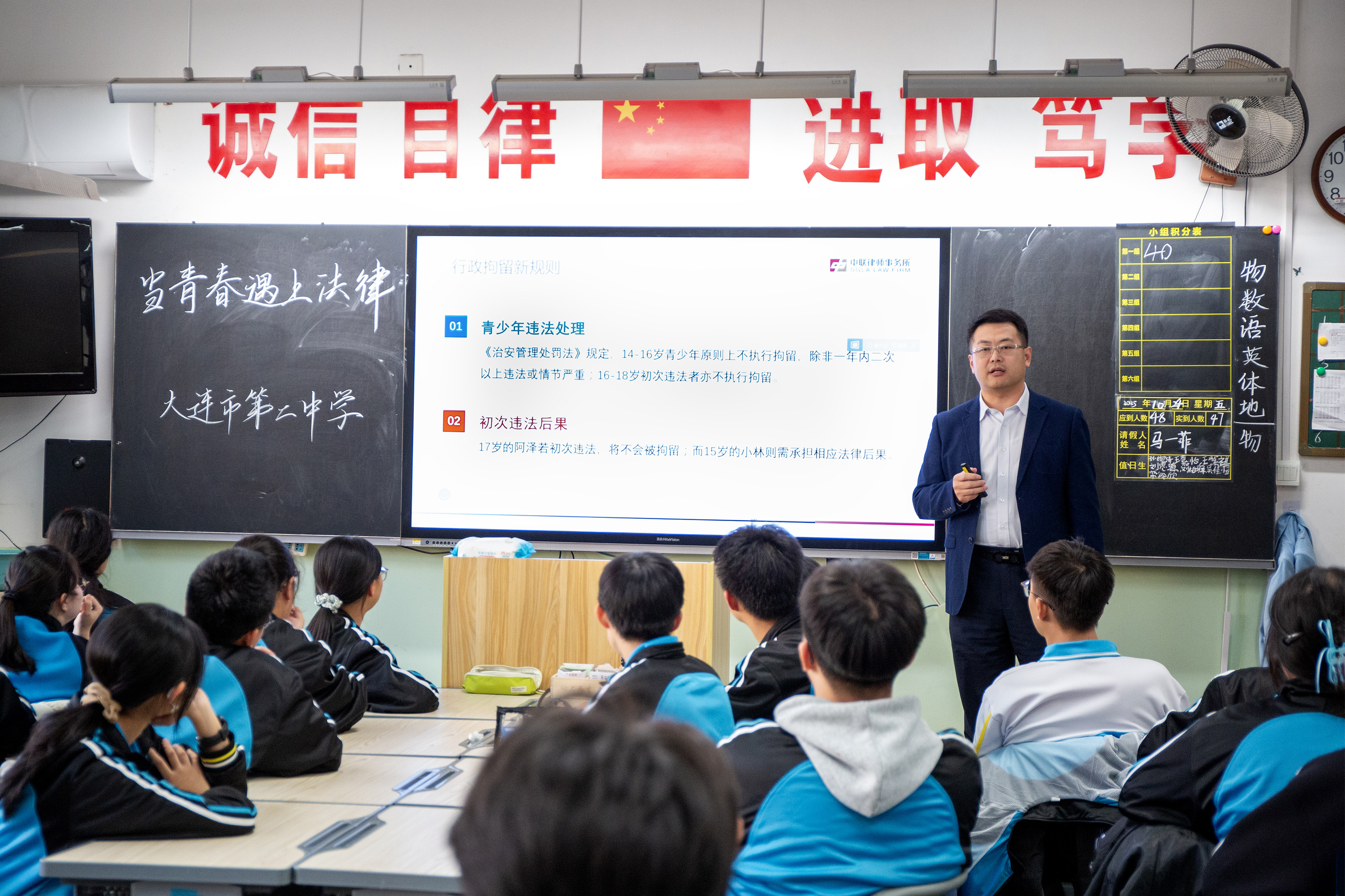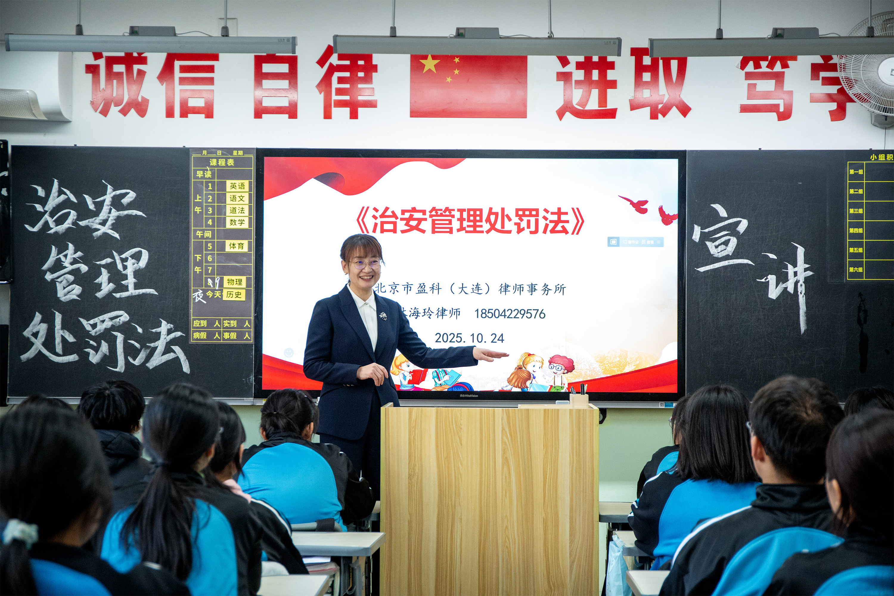 为增强青少年法治意识,预防校园违法行为,2025年10月24日下午,大连市法治文化基层行志愿服务队、北京市盈科(大连)律师事务所的王金海、马铭泽、李鑫、冯丹丹、林海玲、杨艺萌律师,上海中联(大连)律师事务所的郭剑律师,北京市京师(大连)律师事务所的王春红律师,辽宁碧海律师事务所的牟飞律师,大连市中山区人民法院刑事审判庭的陈伟卓、钱容法官走进大连市第二中学,他们每人“承包”一个班级,为高中生宣讲校新修订的《治安管理处罚法》,受到师生的热烈欢迎。