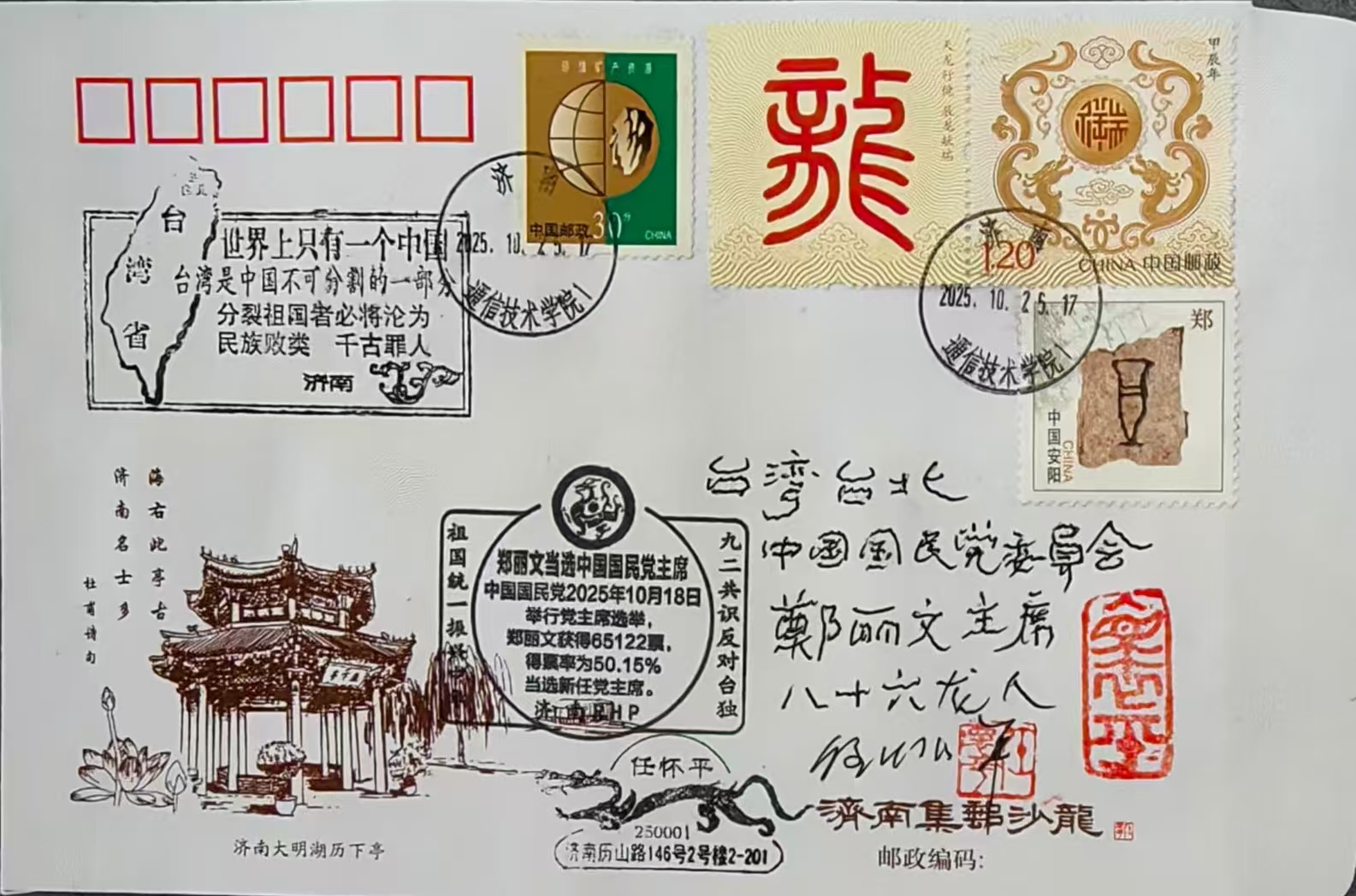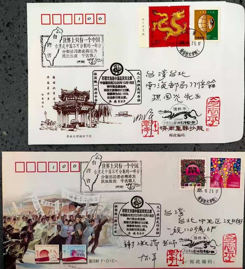 任老已于10月25日当天,将盖有这枚特殊纪念戳和“世界上只有一个中国”宣传戳的信封,寄往全国各地邮友及台湾同胞。其中,一封已直接寄给位于台北的中国国民党新任主席郑丽文女士本人。这一行动本身,就是一次无声却有力的沟通与呼吁,使设计理念转化为实实在在的情感与信息传递。