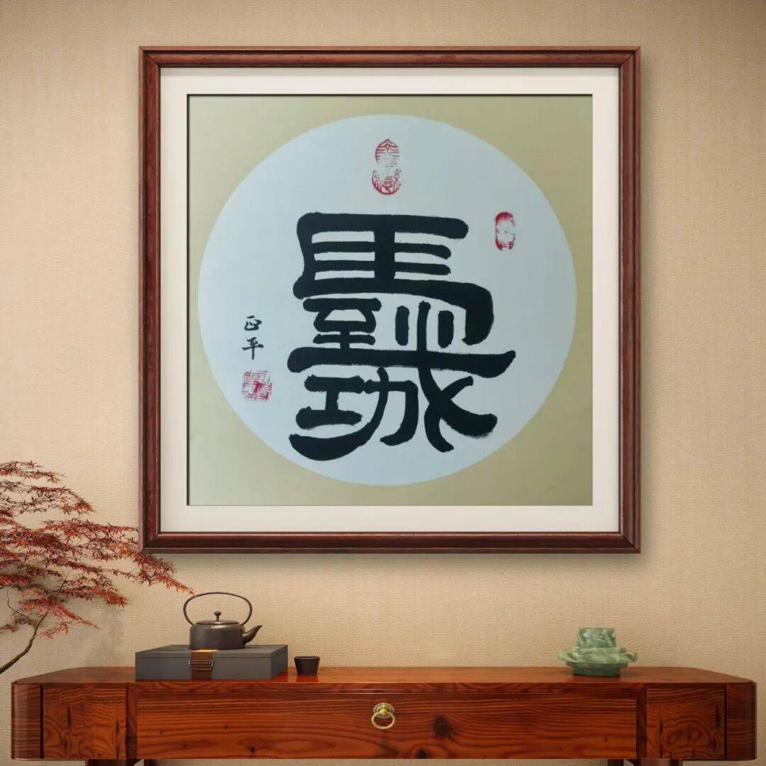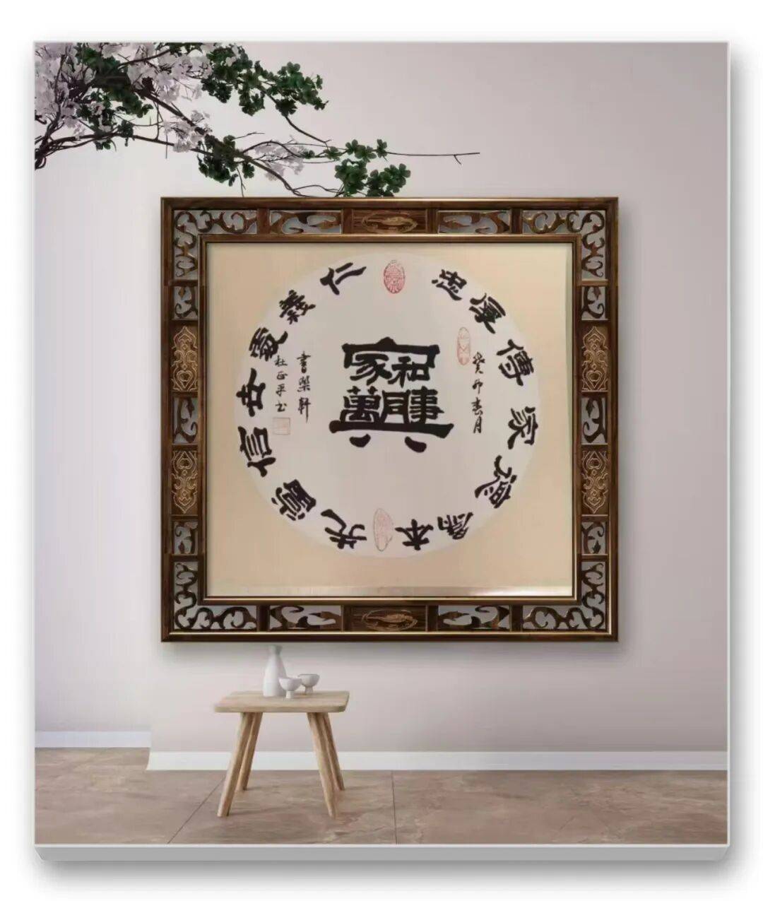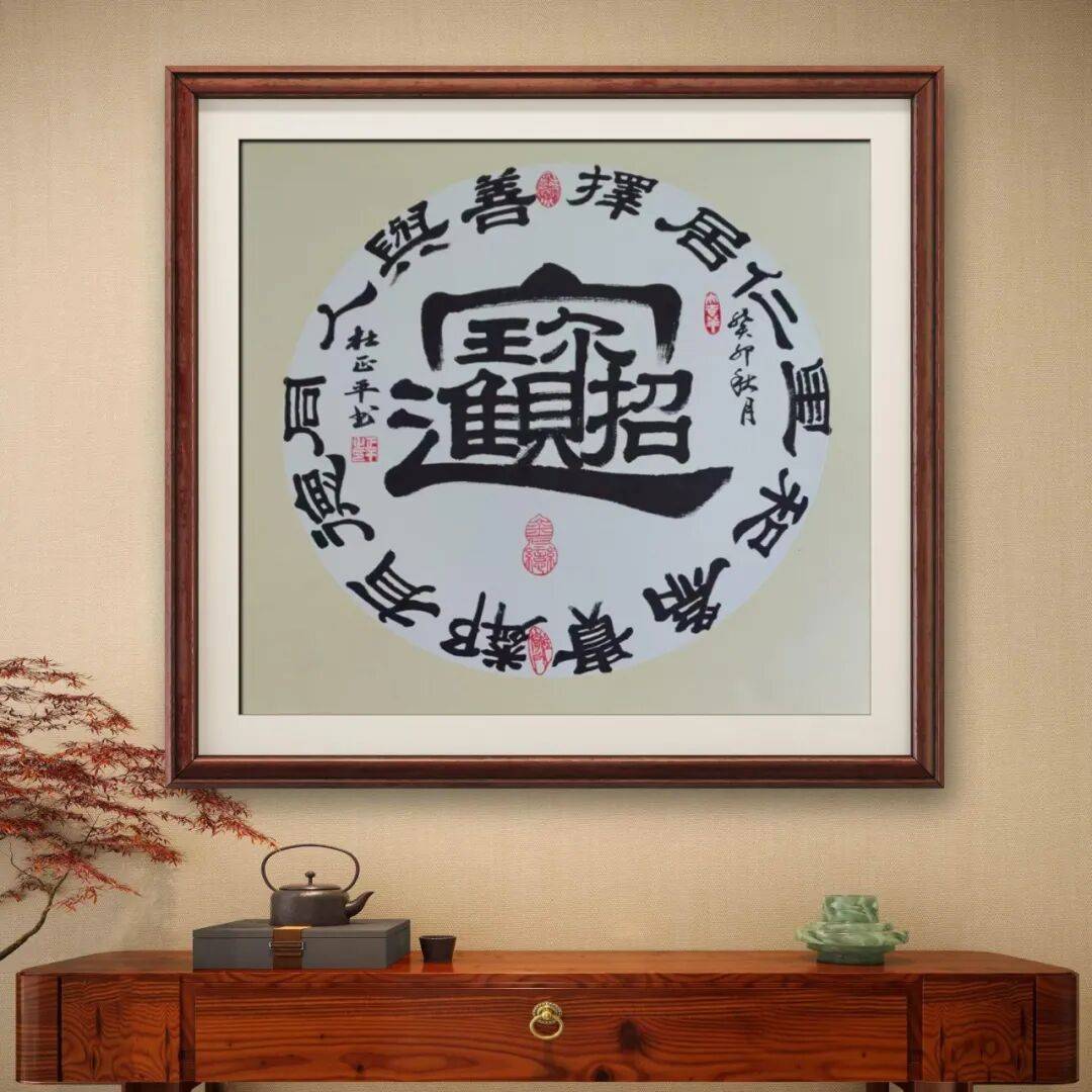 经过长期的临帖与交流,杜正平老师的隶书逐渐走出了自己的风格。观其作品,可感其对隶书“蚕头燕尾”“一波三折”等典型笔法的娴熟驾驭,每一笔都透着扎实的功底。比如他的隶书作品,结体方正大气,笔画浑厚有力,字的波磔舒展有度,字的结构疏密得当,整体给人以沉稳、顺遂的视觉感受与心理期许。以圆形章法布局,隶书端庄饱满,外围环绕的小字又增添了层次与意趣,既体现了他对隶书单体字的把控力,又展现了对整体章法的设计感。