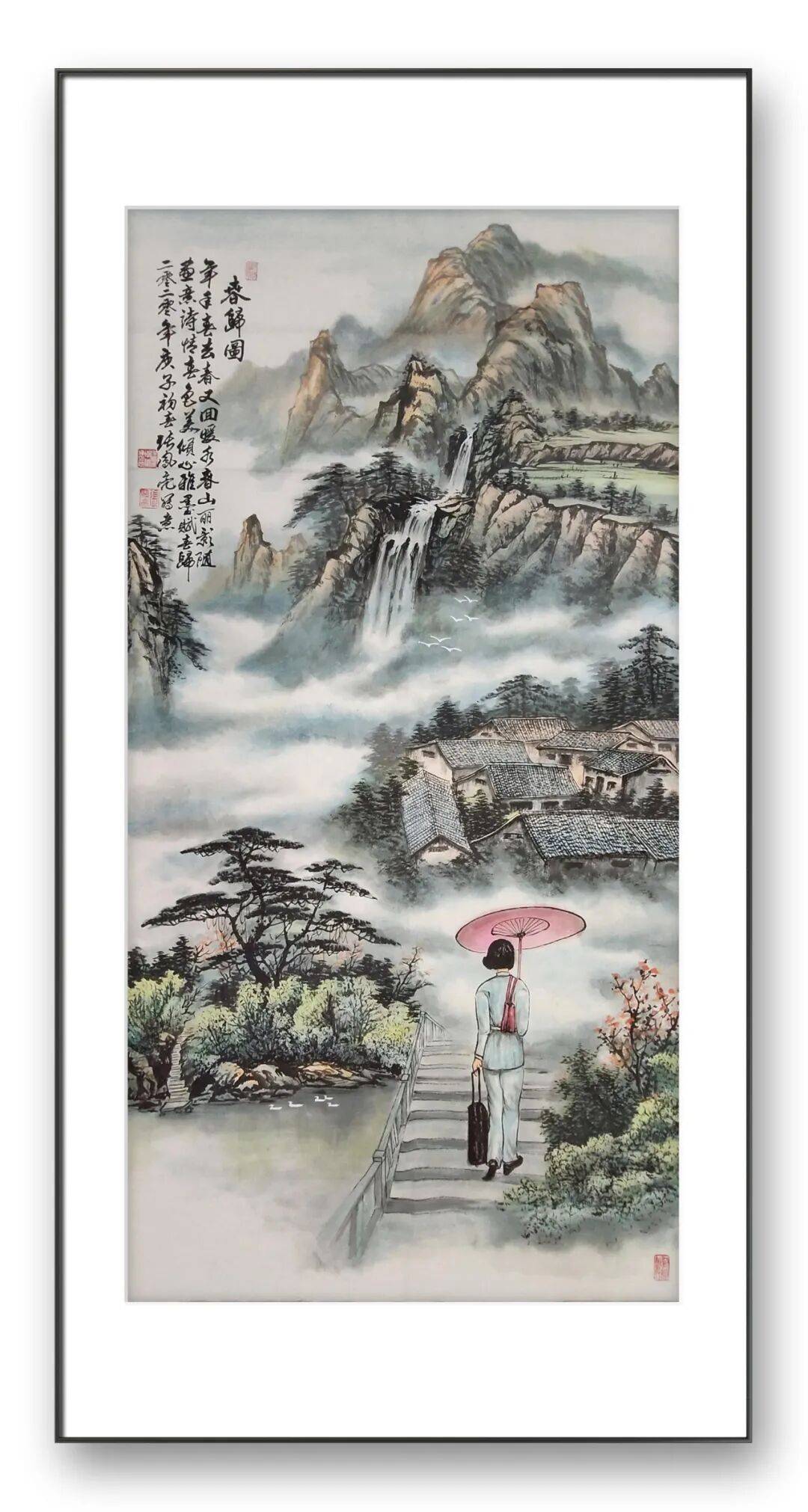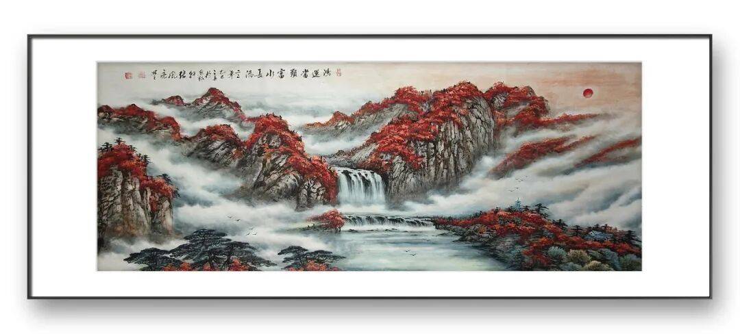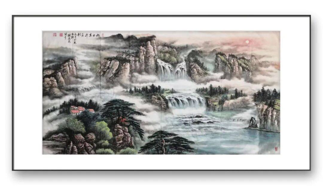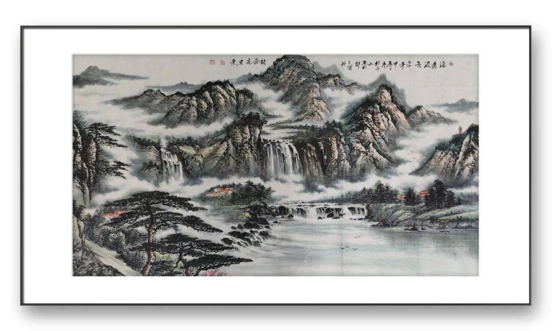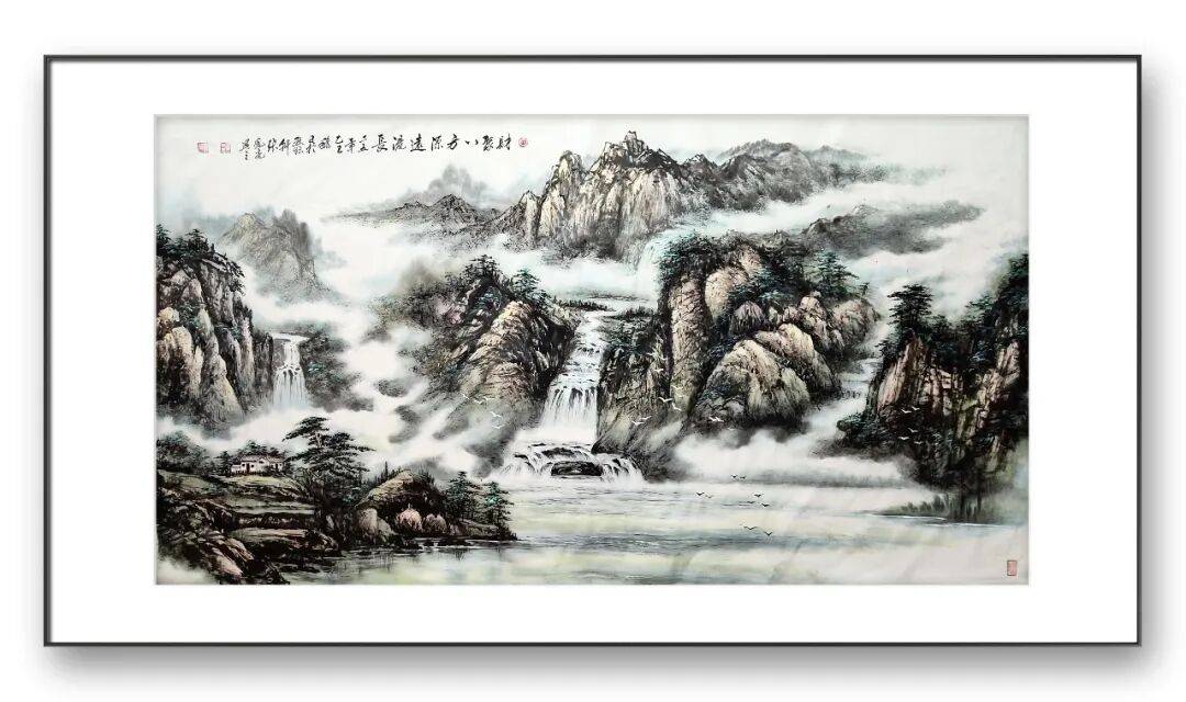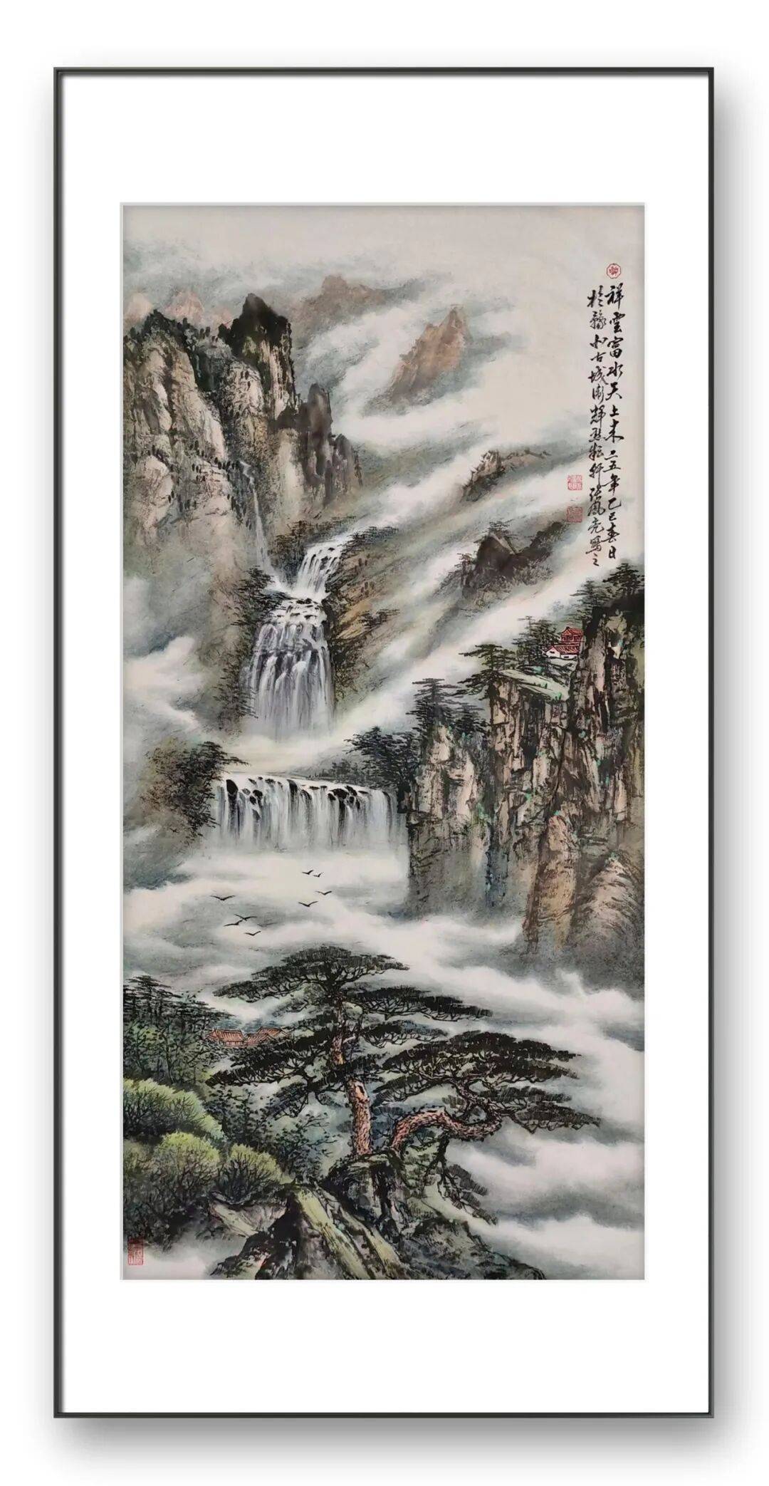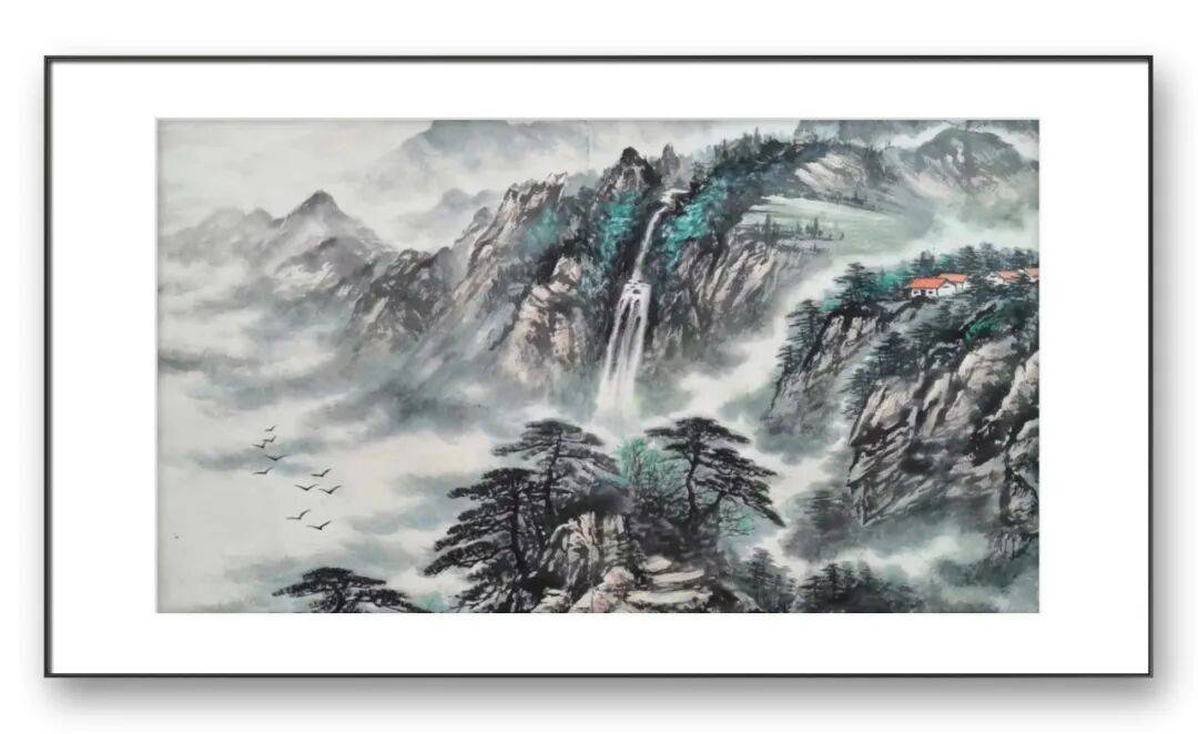 中国山水画的核心在于意境,张凤亮先生的作品在这方面堪称典范。他善于通过构图、色彩与主题的搭配,营造出或雄浑壮阔、或清幽雅致、或吉祥喜庆的多元意境。瀑布飞流直下,水声潺潺仿佛跃出纸面,与周围的云雾、屋舍、飞鸟共同构成了一幅“山环水绕,财源广进”的吉祥图景,既体现了对自然山水的赞美,又寄托了人们对富足生活的向往,将传统山水画的审美价值与民俗寓意巧妙融合。