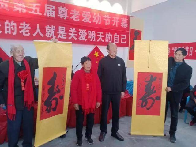 在礼品赠送阶段,郭朝卿老师向新晋八十岁的老人赠送了亲自书写“福”,郭志勇、郭耀刚为各位老人分发了唐装、太空被、保暖衣等。